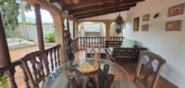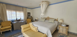 La villa principal tiene capacidad para ocho huéspedes en tres espaciosas habitaciones con baño. Los interiores están diseñados con gusto en un estilo rústico-clásico, mezclando el encanto tradicional con acabados de lujo. Las elegantes zonas de estar y comedor cuentan con una gran chimenea y amplios ventanales que inundan el espacio de luz natural y enmarcan hermosas vistas al jardín. Una cocina totalmente equipada se abre a un auténtico patio andaluz con una fuente decorativa, que ofrece un entorno sereno y elegante para cenas privadas o reflexiones tranquilas.