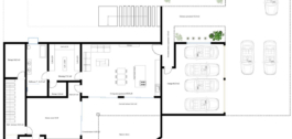 La planta baja: hall de entrada con ascensor, aseo de invitados, sala de instalaciones técnicas, amplio salón/comedor con gran cocina abierta totalmente equipada con electrodomésticos Bosch y despensa independiente, además hay en esta planta un dormitorio/estudio independiente con baño en-suite, amplias terrazas cubiertas con vistas a la gran piscina climatizada de 51,50 m2.