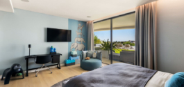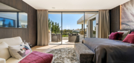 La entrada principal con gran vestíbulo, baño de invitados y ascensor, conduce a la gran sala de estar y comedor de planta abierta con cocina de diseño de Siematic que incluye electrodomésticos Gaggenau. También hay acceso de servicio a la cocina desde el puerto de coches en la entrada de la calle a la villa. En la zona de estar, las silenciosas ventanas eléctricas desaparecen cuidadosamente en las paredes revestidas de piedra para llevarnos a la generosa terraza flotante donde podemos disfrutar de las magníficas vistas al Mediterráneo y al campo de golf. En este nivel de la villa también se encuentra el lujoso dormitorio principal con terraza privada, baño en suite y vestidor privado.