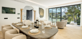 En el interior, los espacios son excepcionales. Los arcos curvos realzan la estética al tiempo que mantienen una distribución diáfana que fluye sin esfuerzo de una habitación a otra. La cocina y el comedor son los elementos más destacados, decorados con madera natural y diseñados pensando tanto en el estilo como en la funcionalidad. Equipada con electrodomésticos de primera calidad (Gaggenau) y armarios a medida, la cocina fusiona forma y funcionalidad. Dos elegantes zonas de estar, una más íntima que la otra, ofrecen opciones flexibles para recibir o relajarse, todas ellas amuebladas con piezas cuidadosamente seleccionadas que elevan el ambiente general.