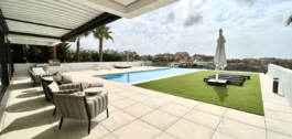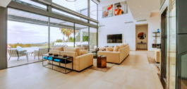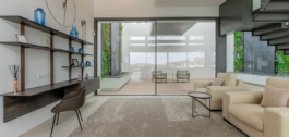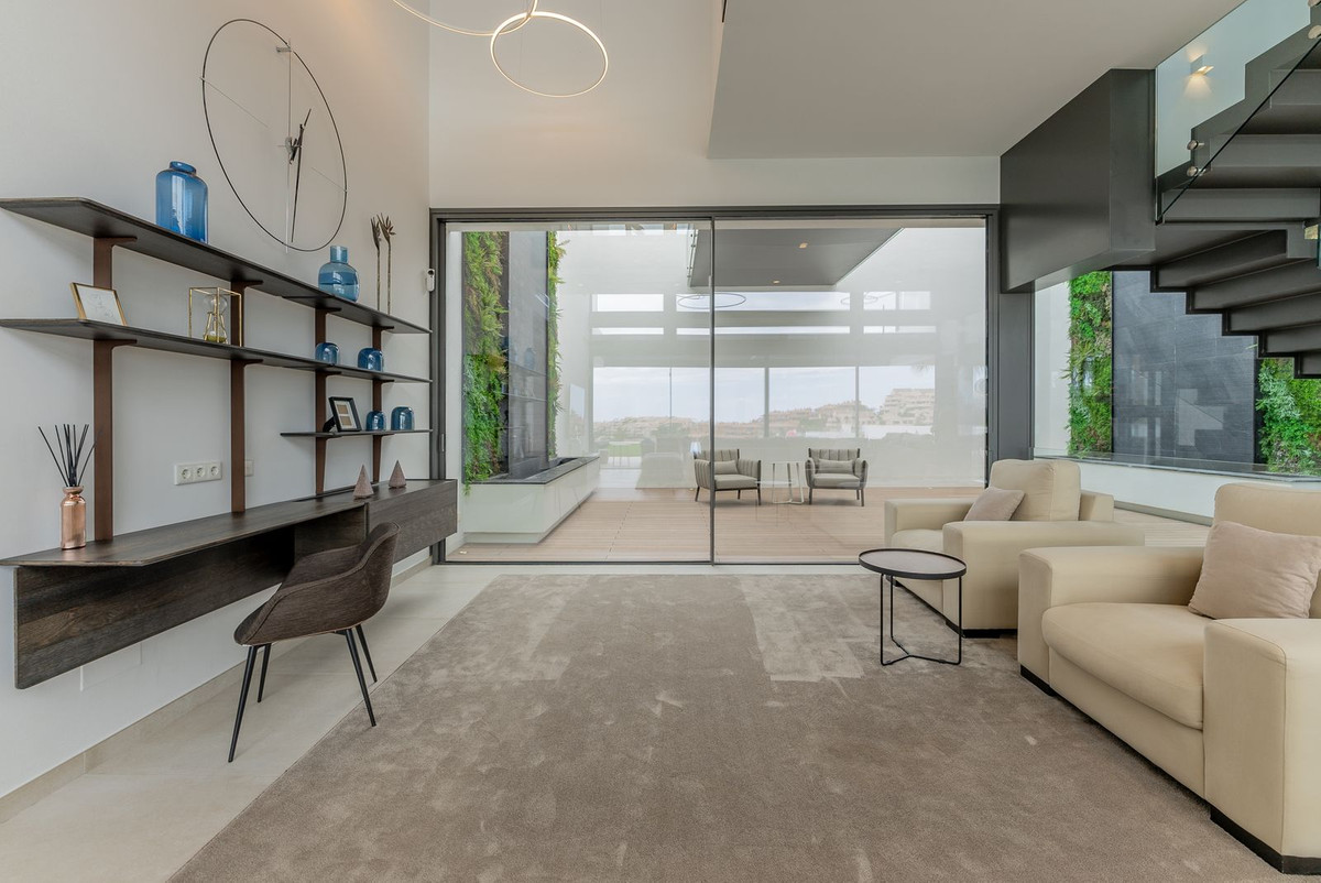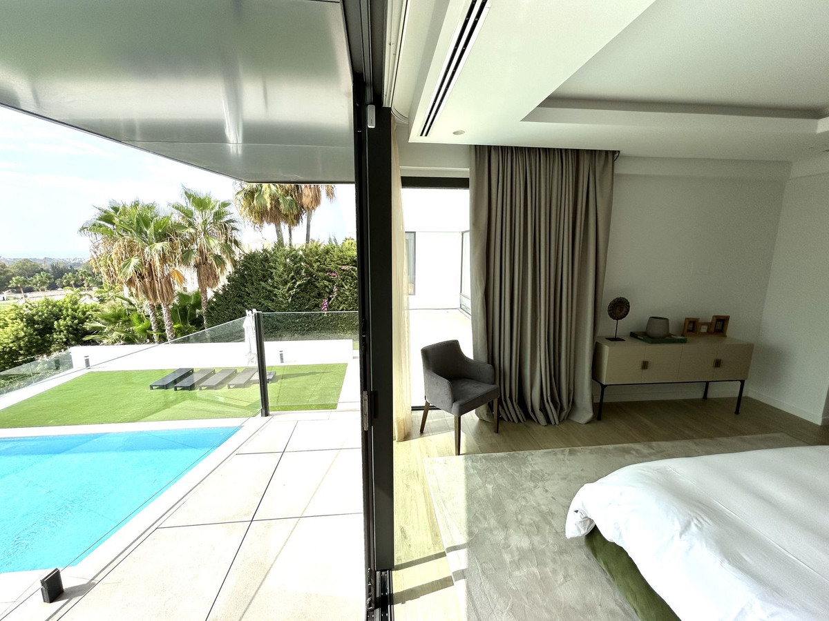 Nada más entrar en esta casa ultraconfortable y respetuosa con el medio ambiente, uno se siente cautivado por las vistas abiertas al campo de golf y al mar y transportado a un reino de lujo moderno sin parangón que estimula los sentidos y despierta una creatividad sin límites. La villa cautiva por sus exquisitos detalles arquitectónicos, sus espacios diáfanos de techos altos y sus amplias paredes de cristal. La refinada paleta de colores, con tonos grises junto a un atemporal dúo de blanco y negro, desprende un ambiente elegante, con estilo y siempre a la moda.