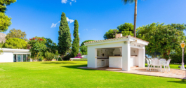 Jardin con diferentes zonas de relax con fuentes, piscina exterior de agua salada,barbacoa, juegos infantiles