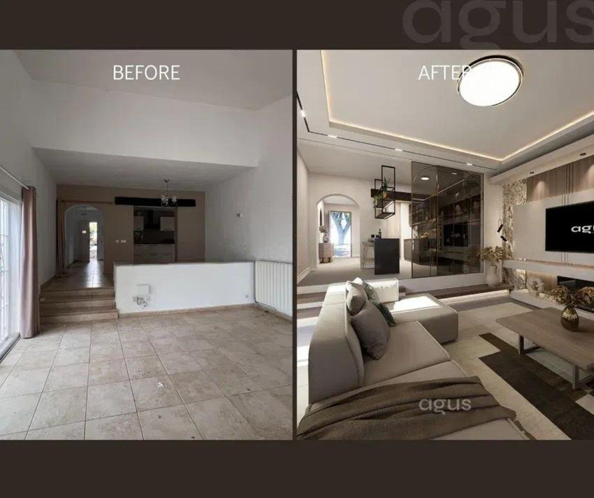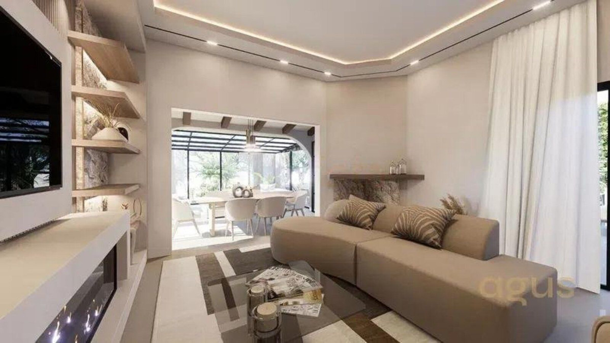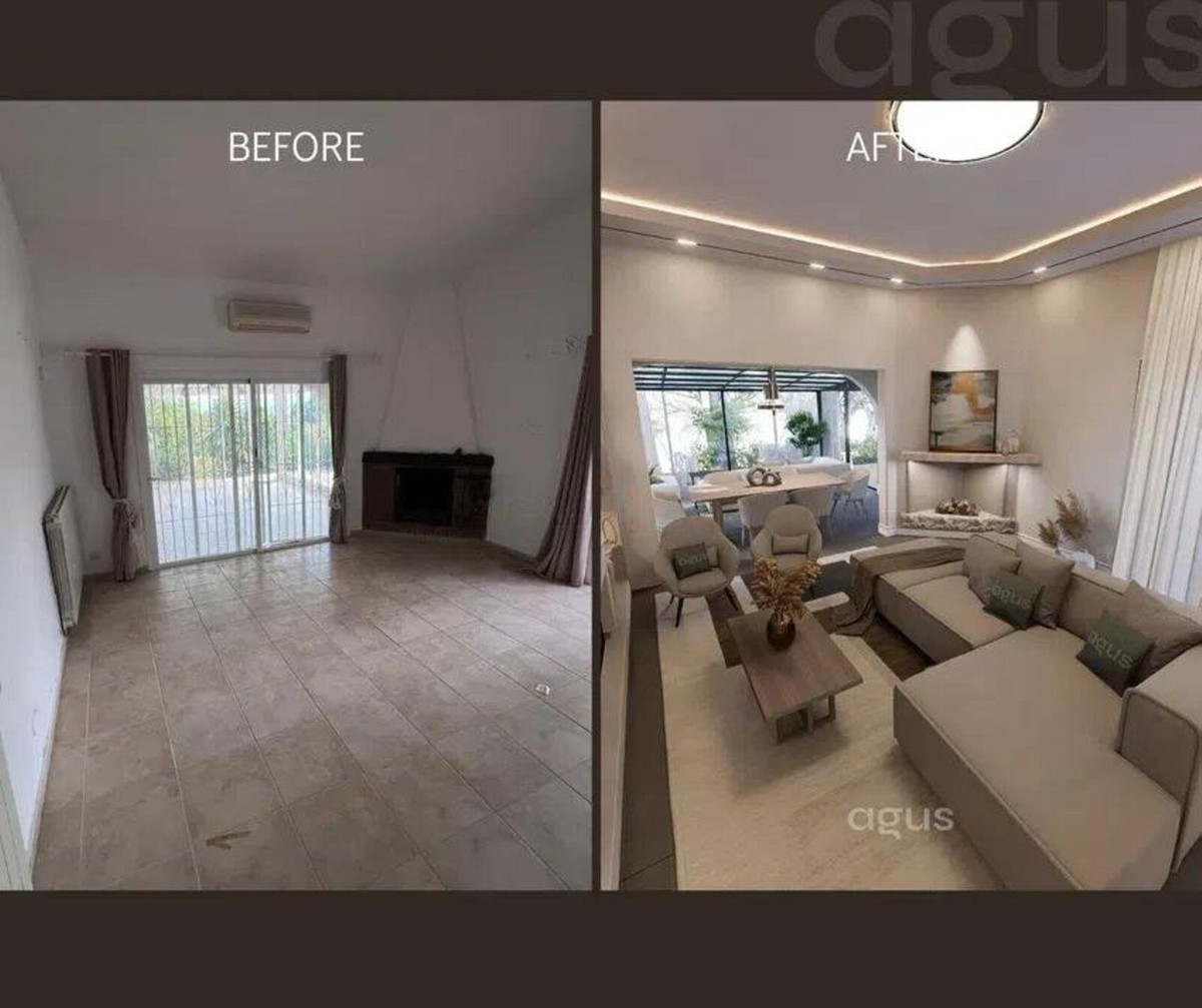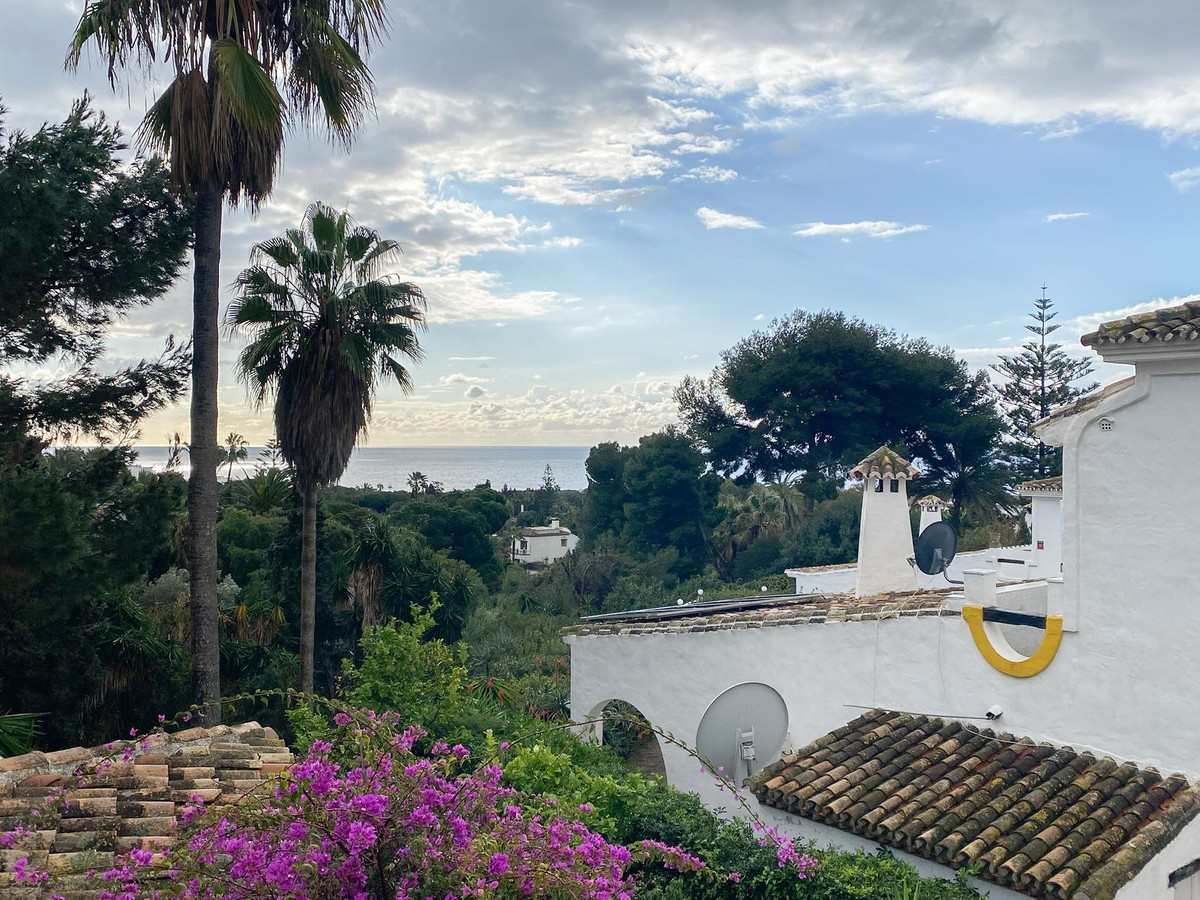 La propiedad presenta un diseño clásico con un amplio salón distribuido en dos niveles y una cocina independiente. Actualmente cuenta con tres dormitorios, todos con baño en suite, y espacio suficiente para añadir un cuarto dormitorio tras una reforma. Amplias terrazas y un jardín de invierno aportan luz natural y versatilidad al espacio, mientras que el salón, con su acogedora chimenea, es perfecto para las noches más frescas. El dormitorio principal se encuentra en la planta superior y cuenta con un amplio cuarto de baño y una terraza privada. Toda la casa está equipada con aire acondicionado para mayor comodidad.