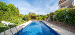 El jardín tiene una gran piscina, una zona chill out y varios árboles frutales.