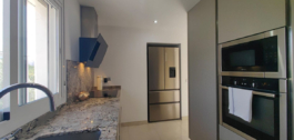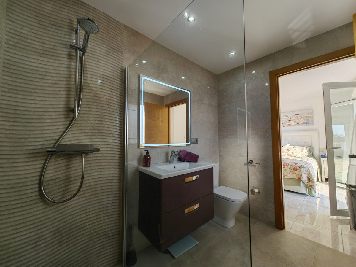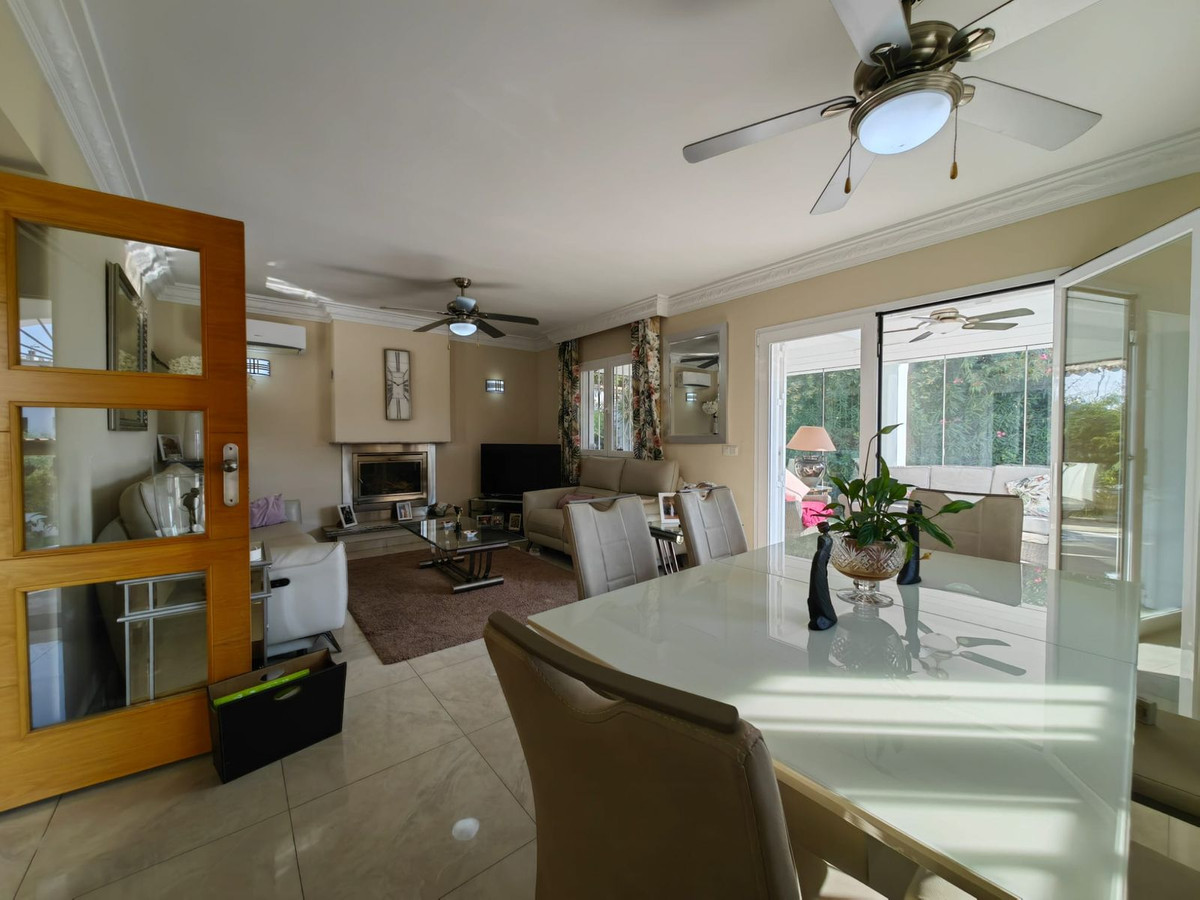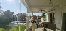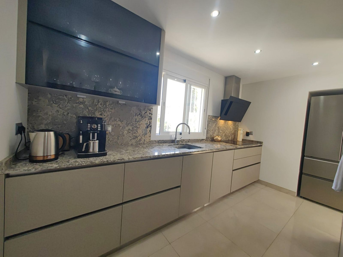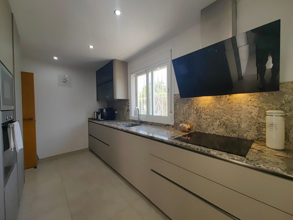 En el corazón de la casa se encuentra una moderna cocina totalmente equipada con un práctico fregadero y una entrada secundaria para mayor comodidad. La amplia zona de estar y comedor se abre a una terraza cubierta con cortinas de cristal, perfecta para disfrutar todo el año, incluso en los días más fríos de invierno. Otra terraza abierta ofrece un lugar soleado con vistas a la piscina.