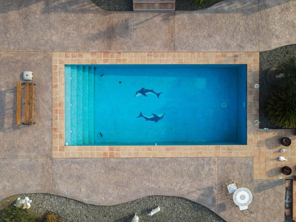 La propiedad cuenta con una amplia zona de piscina rodeada de un terreno con una suave pendiente, que ofrece tanto privacidad como potencial para el paisajismo o la jardinería.