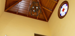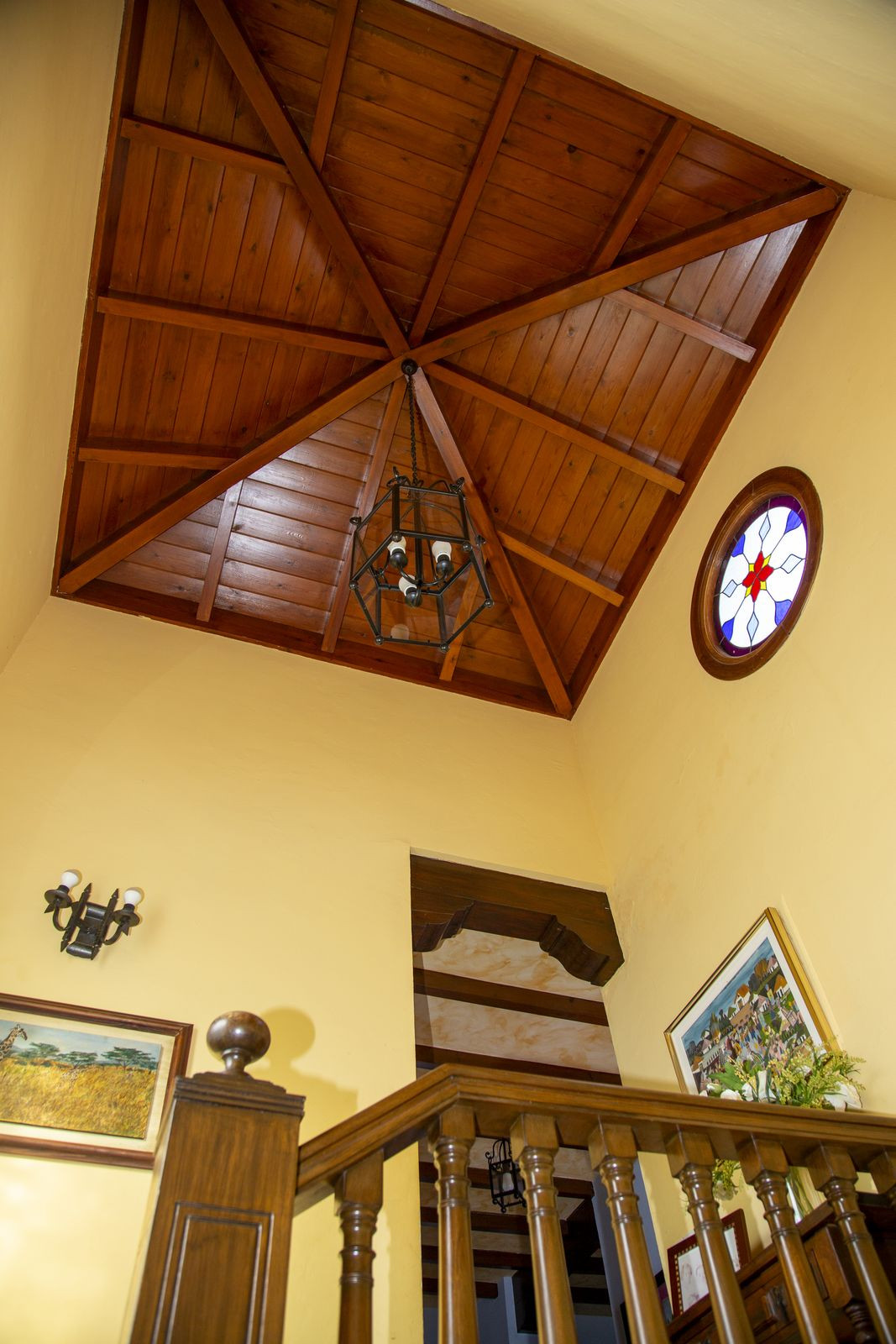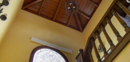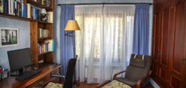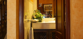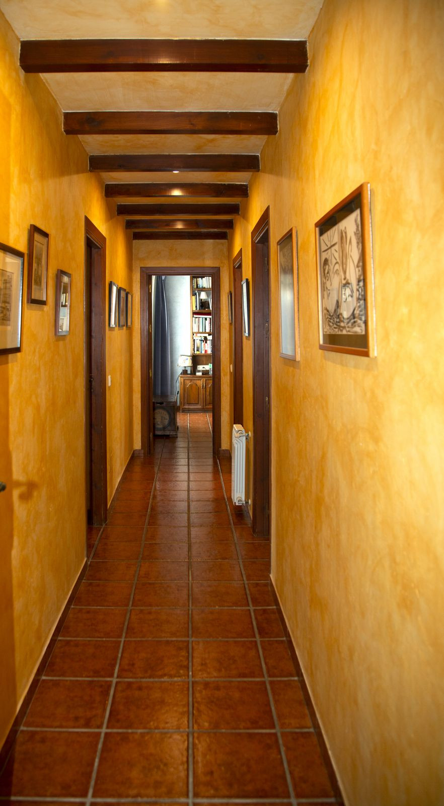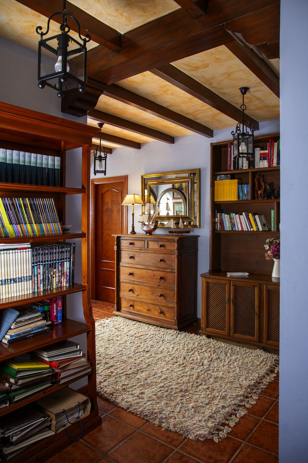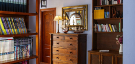 En la planta superior, subiendo las escaleras, con un espectacular artesonado de madera en forma de torre, hay un gran pasillo que da acceso a 2 dormitorios con acceso a la terraza, un baño y una gran sala de despacho/biblioteca que se puede utilizar para diferentes usos dependiendo de las necesidades.