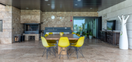 La zona exterior cuenta con una extraordinaria piscina infinita de agua salada con cascada, zona de entarimado con tumbonas y un espectacular y enorme jardín que destaca por su huerto ecológico, árboles tropicales y una huerta.