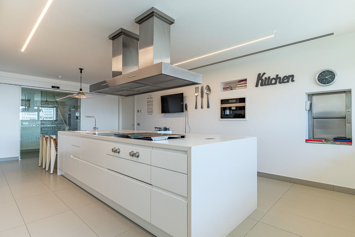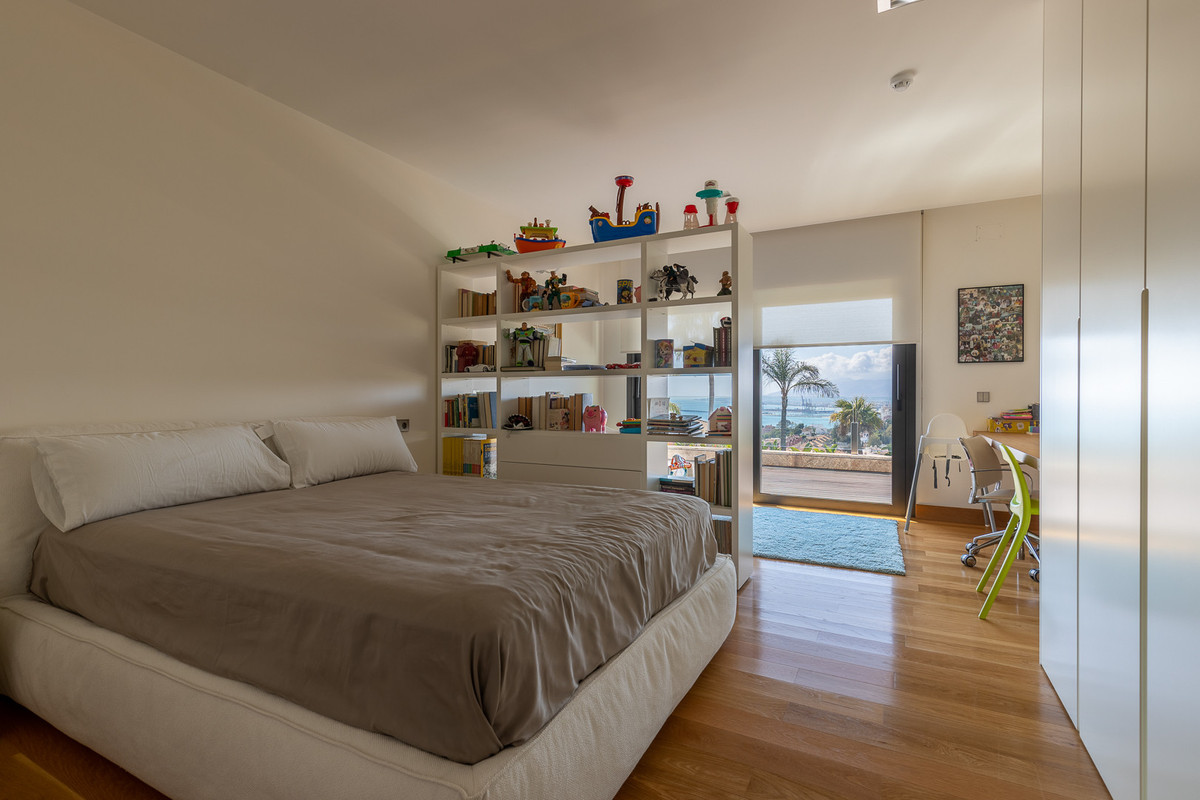 La planta baja de la villa con acceso al jardín consta de zona de juegos y barbacoa que cuenta con un montaplatos que conecta directamente con la cocina. El nivel superior con acceso a la zona de la piscina consta de bodega, gimnasio totalmente equipado, jacuzzi, sauna, baño turco y vestidor. La primera planta da la bienvenida a un espectacular salón con impresionantes vistas panorámicas al mar, zona de comedor y cocina de última generación con isla. Además, en este nivel hay 4 dormitorios en suite, lavadero y apartamento de servicio con dos dormitorios, salón y un baño. La segunda planta alberga un despacho con acceso al solárium y un dormitorio principal en suite con vestidor y acceso a una amplia terraza.
