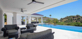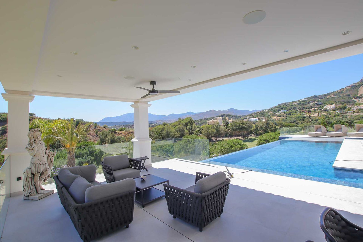 Una de las características más destacadas de esta villa son sus impresionantes vistas. Tanto si está relajándose en el salón, disfrutando de una comida en la terraza o dándose un chapuzón en la piscina infinita, las impresionantes vistas de los verdes campos de golf y las montañas circundantes crean un pintoresco telón de fondo que realza el encanto y la tranquilidad de la villa. Además, hay una parte de los terrenos de la villa donde se puede disfrutar de hipnotizantes vistas al mar, añadiendo otra capa de belleza natural a su experiencia.