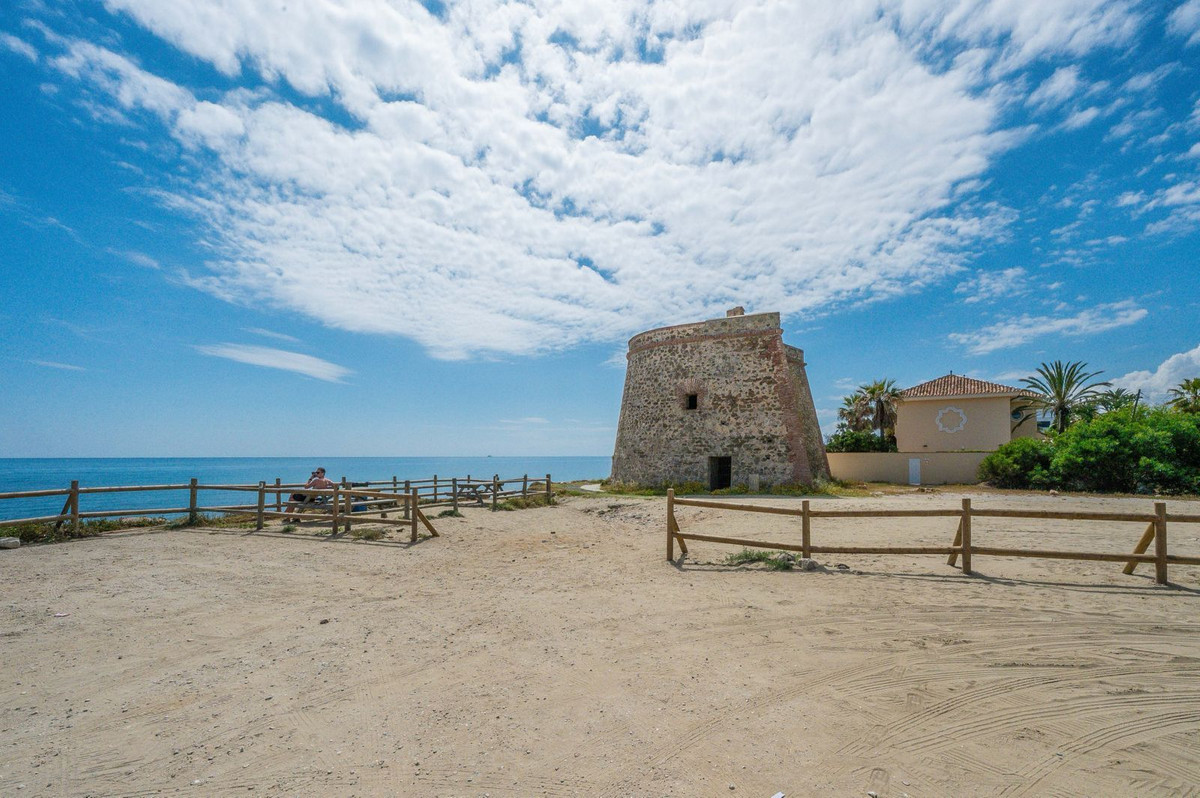 Planta superior: Tres dormitorios dobles bien presentados, incluyendo el principal con baño en-suite y acceso a una terraza de 36m² que ofrece impresionantes vistas al mar y al histórico Torreón de Lance de las Cañas del siglo XVIII.