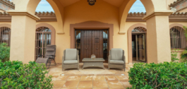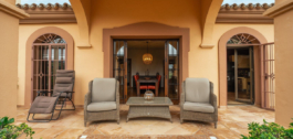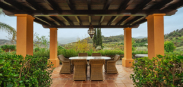 – Patio que conduce a la terraza de la piscina, equipada con una zona de estar cubierta perfecta para comer y relajarse.