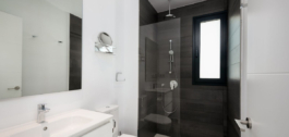 La villa se distribuye en dos niveles. En la planta baja, le da la bienvenida un generoso vestíbulo de entrada que conduce a una sala de estar bellamente diseñada, que está perfectamente integrada con las zonas de comedor y cocina. Los grandes ventanales dan a los magníficos jardines, proporcionando mucha luz natural. Junto a la cocina hay un lavadero independiente con acceso a una cochera cubierta con capacidad para dos coches. Este nivel también cuenta con un cómodo dormitorio doble con baño en suite, una terraza privada y un aseo independiente.