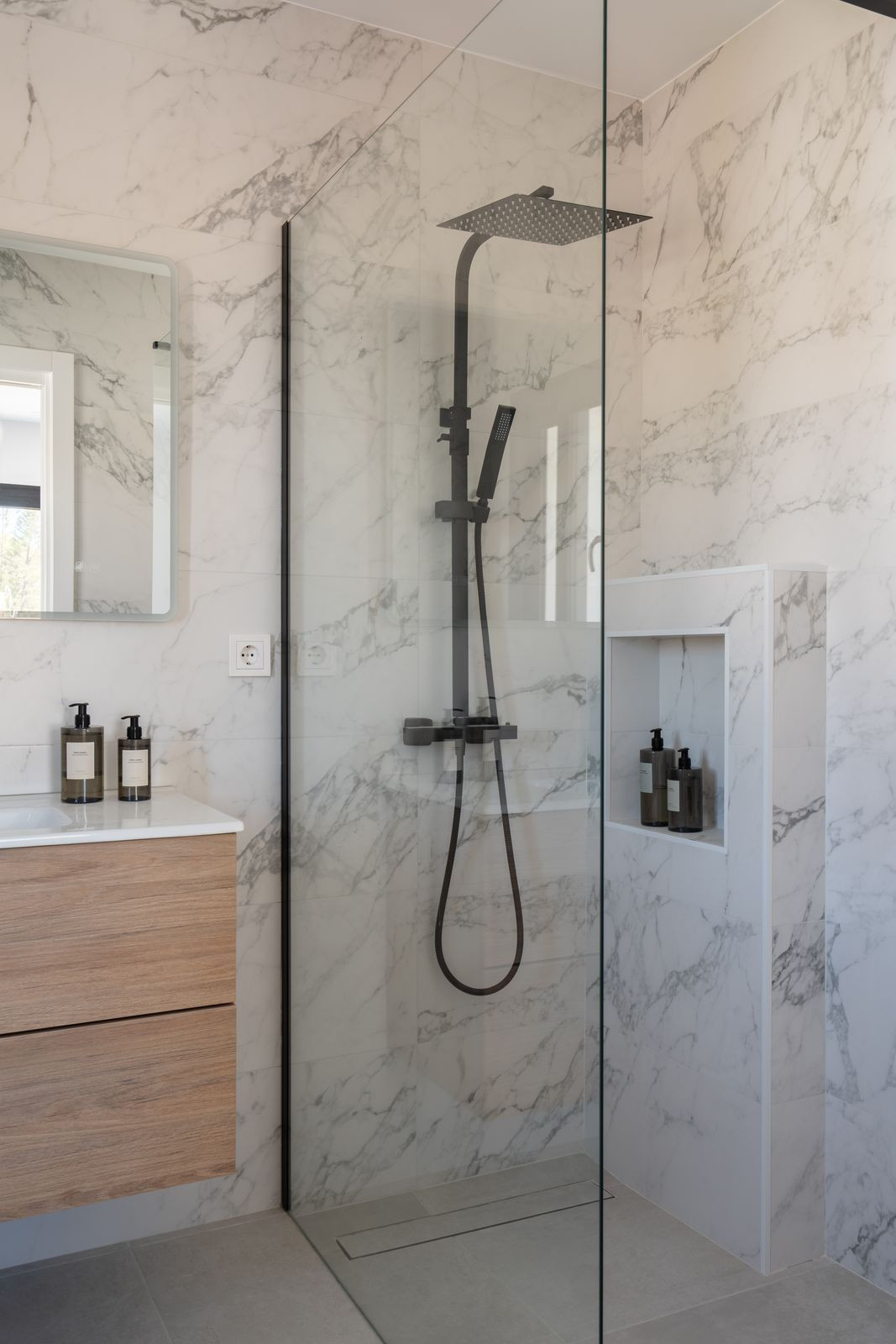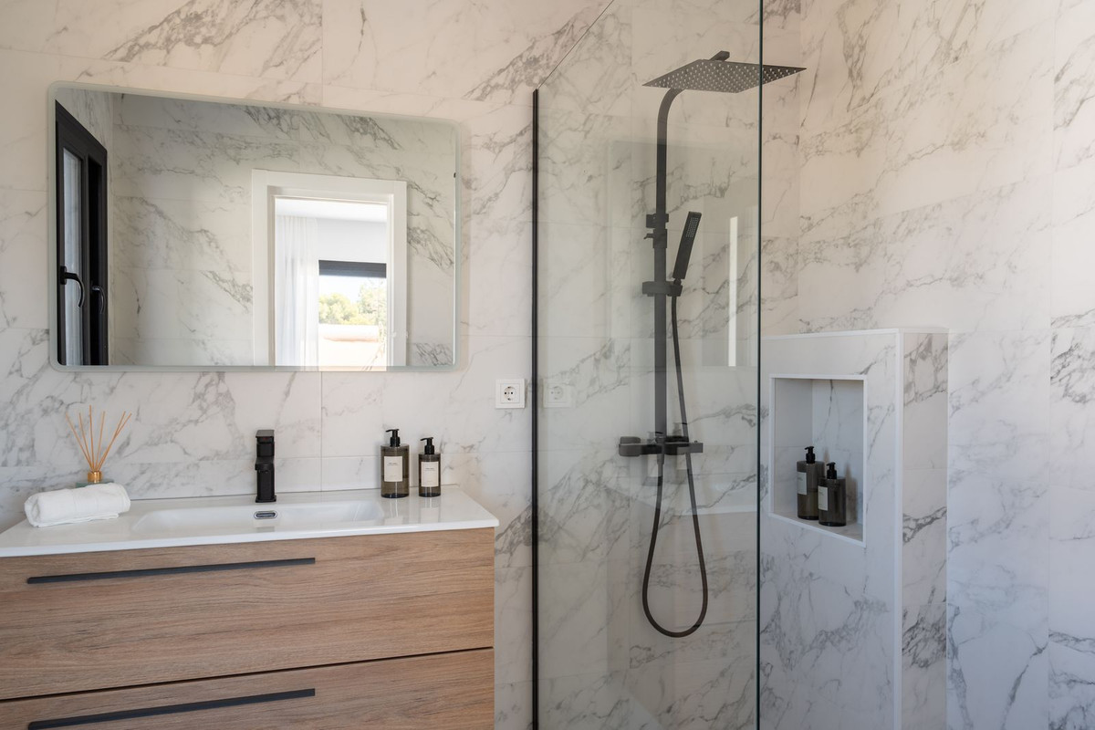 Distribuida en dos plantas, la casa cuenta con tres amplios dormitorios, cada uno con su propio cuarto de baño. Dos de los dormitorios disfrutan de hermosas vistas parciales al mar, mientras que un elegante aseo de invitados añade comodidad adicional.