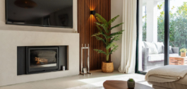 Células solares que dan a la villa un espacio de vida energéticamente eficiente, chimenea en el salón para una encantadora sensación acogedora y calor natural.