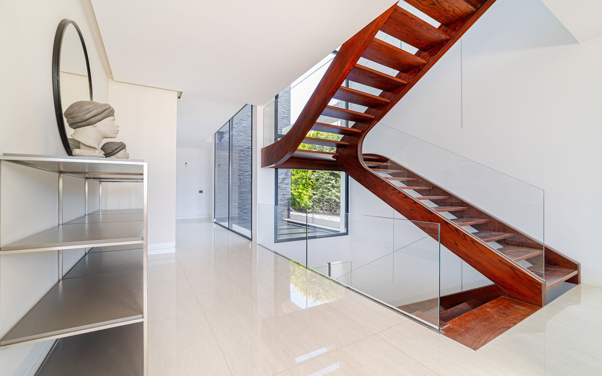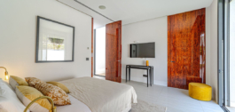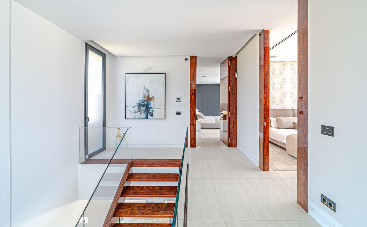 En el mismo nivel, encontrará el dormitorio principal con su propio cuarto de baño, grandes ventanas de arriba a abajo y un diseño de estilo abierto con bañera, ducha separada e inodoro. Al bajar las escaleras, hay otra sala de estar con vistas a la piscina que invita a relajarse. A la derecha, le esperan dos dormitorios, uno de ellos con baño propio y vistas a la piscina. Frente a ellos, hay otro dormitorio con su propio cuarto de baño y vistas a la piscina.