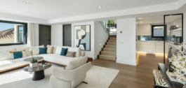 En el interior, el diseño refinado se une a la elegancia atemporal. Cada espacio está impecablemente decorado con muebles hechos a medida y acabados de primera calidad por el aclamado estudio de interiorismo La Albaida. Las zonas de estar y comedor de concepto abierto disfrutan de un flujo perfecto entre el interior y el exterior a través de grandes puertas de cristal, que inundan la casa de luz natural y conectan sin esfuerzo con las terrazas exteriores.