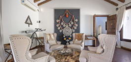 – Elegante salón con un encantador patio y chimenea