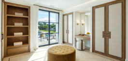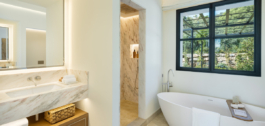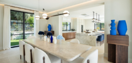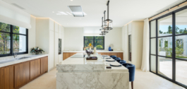En el interior, la elegancia atemporal define cada espacio. Los muebles hechos a medida y la refinada decoración crean un ambiente sofisticado, mientras que las terrazas superiores proporcionan una vida interior-exterior sin esfuerzo. Los amplios ventanales inundan los interiores de luz natural, realzando la sensación de amplitud de la casa.