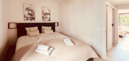 Confort y comodidad: Manténgase fresco con aire acondicionado en todo el apartamento y aproveche la lavandería con lavadora y aseo de invitados para mayor practicidad.