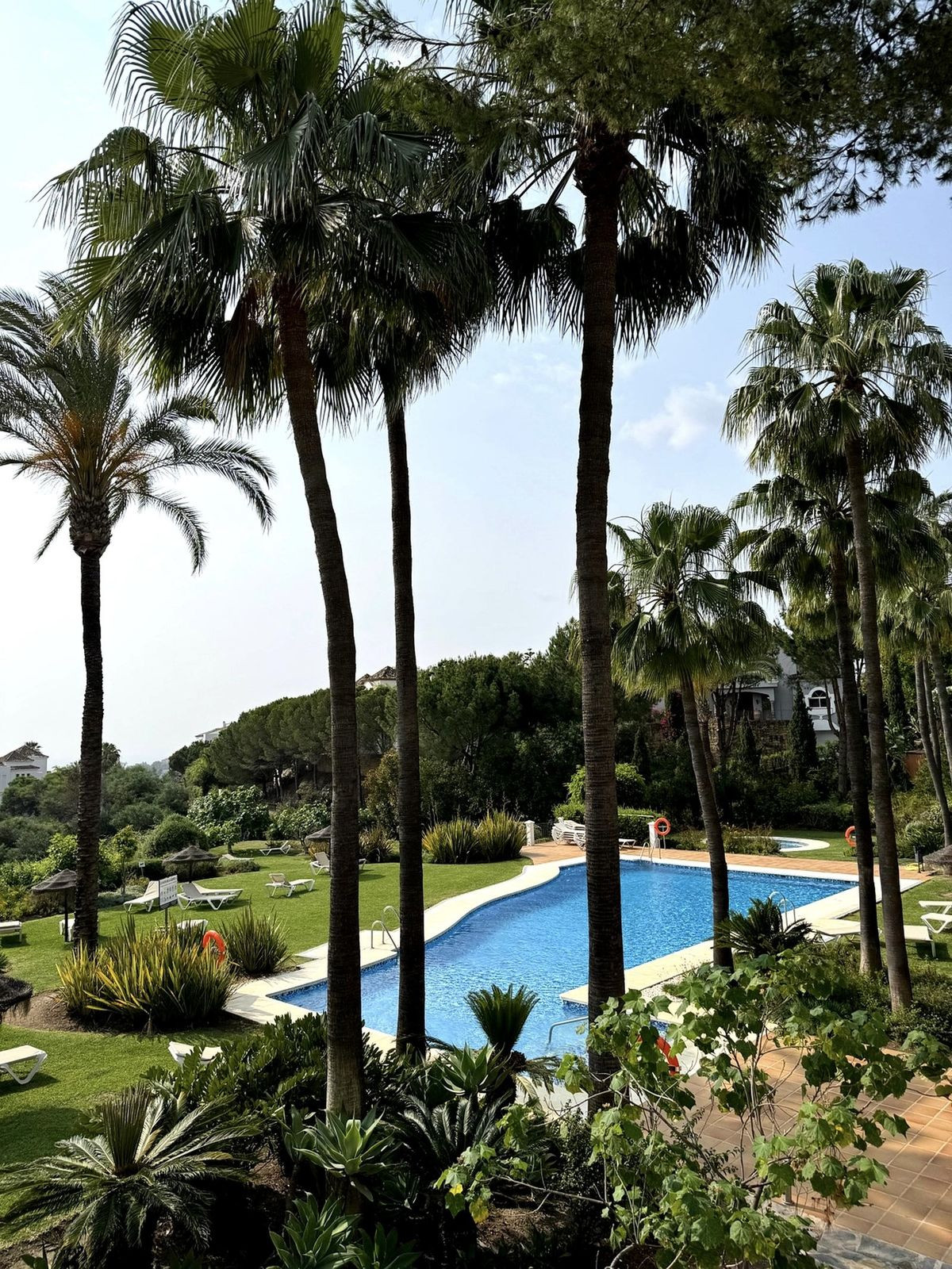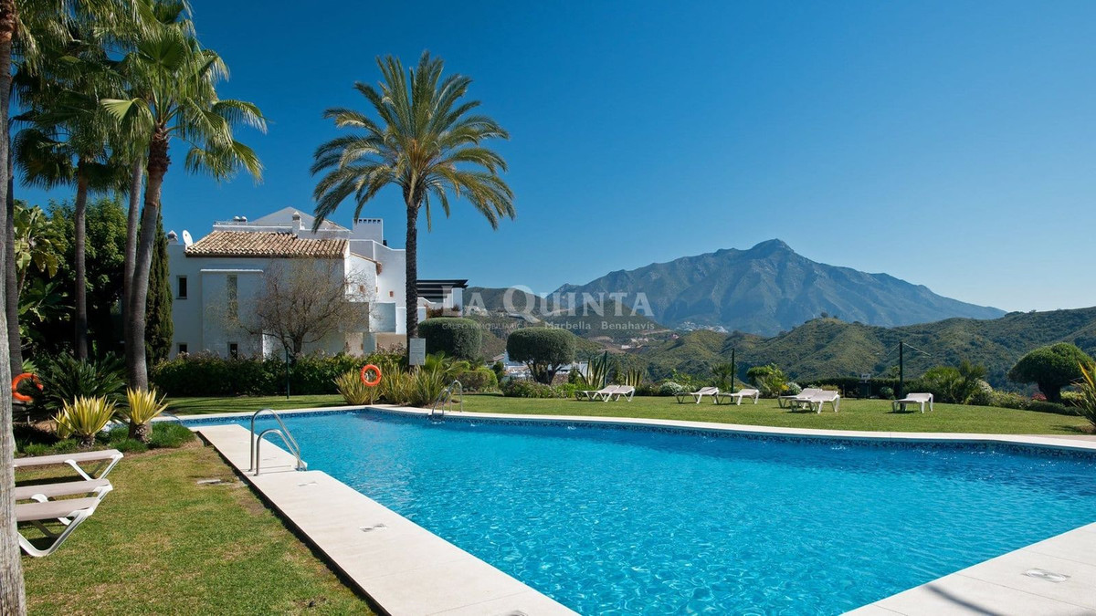 Este apartamento de 2 dormitorios en planta baja está situado en una urbanización cerrada y segura en la prestigiosa zona de La Quinta. Ofrece impresionantes vistas a la montaña y parciales al mar, junto con una gran terraza cubierta privada que proporciona un entorno sereno para relajarse o entretenerse.