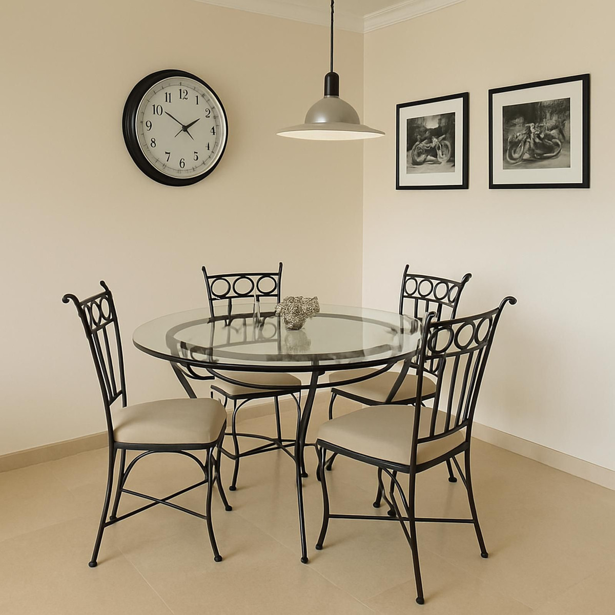 El luminoso salón cuenta con una zona de comedor y se abre perfectamente a la terraza a través de amplias puertas correderas de cristal, inundando el espacio con luz natural. La cocina independiente está totalmente equipada con electrodomésticos Bosch de alta calidad, incluyendo nevera-congelador, horno, lavavajillas, placa eléctrica y campana extractora. Un lavadero independiente alberga la lavadora y la secadora para mayor comodidad.