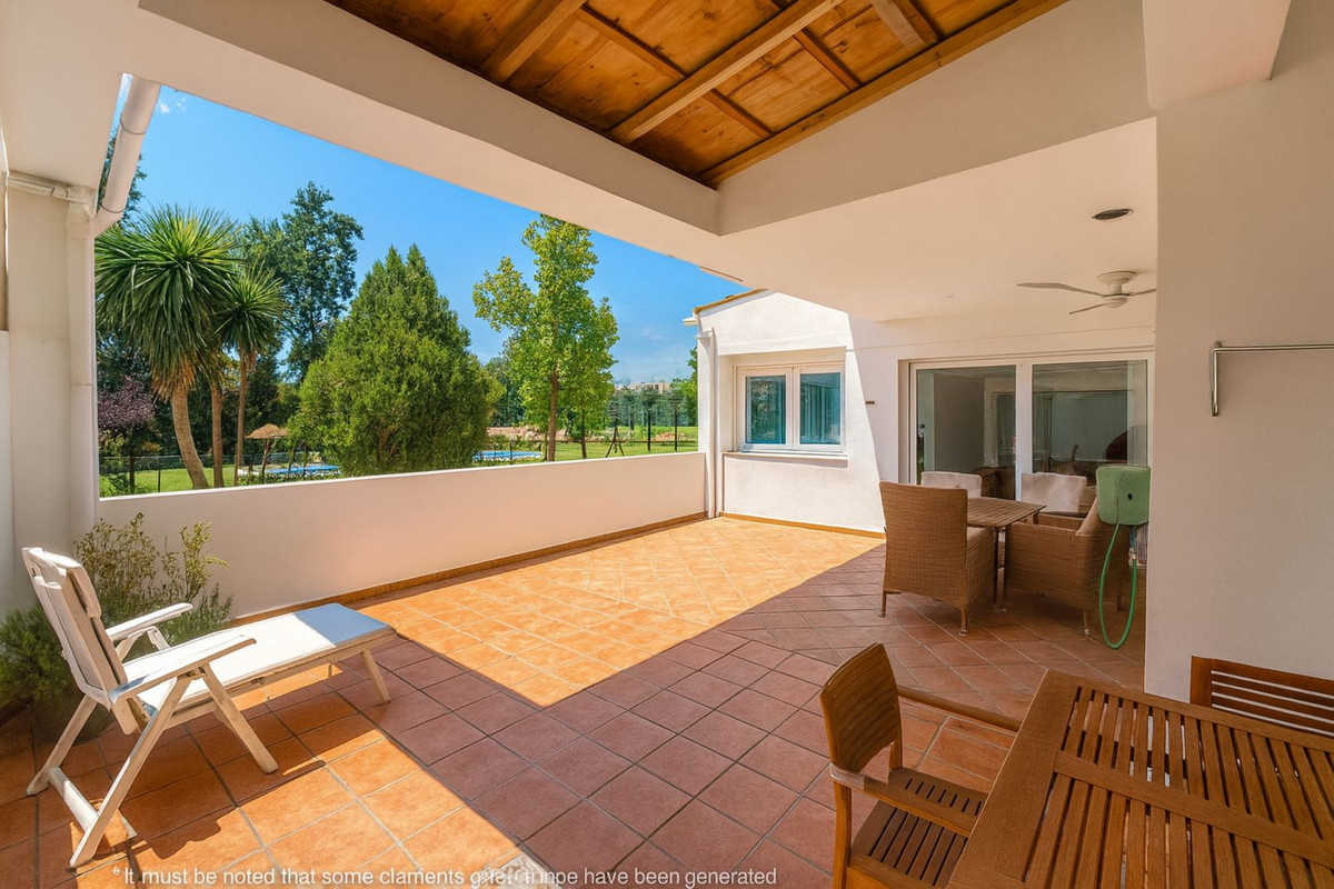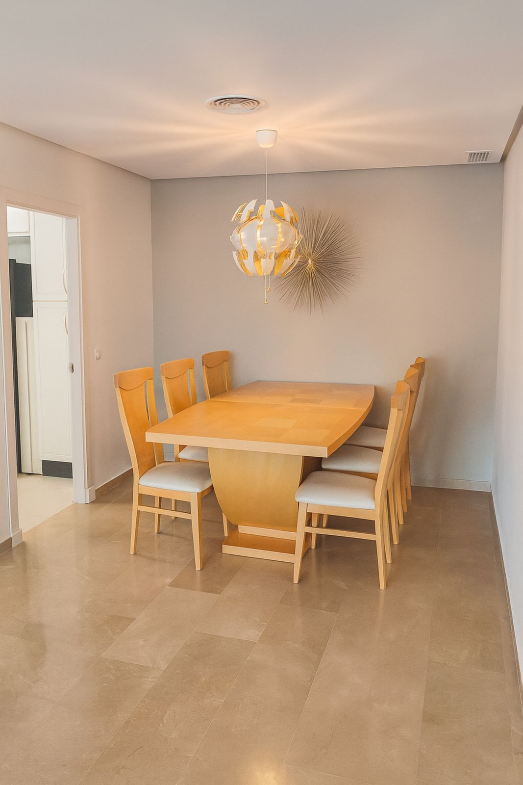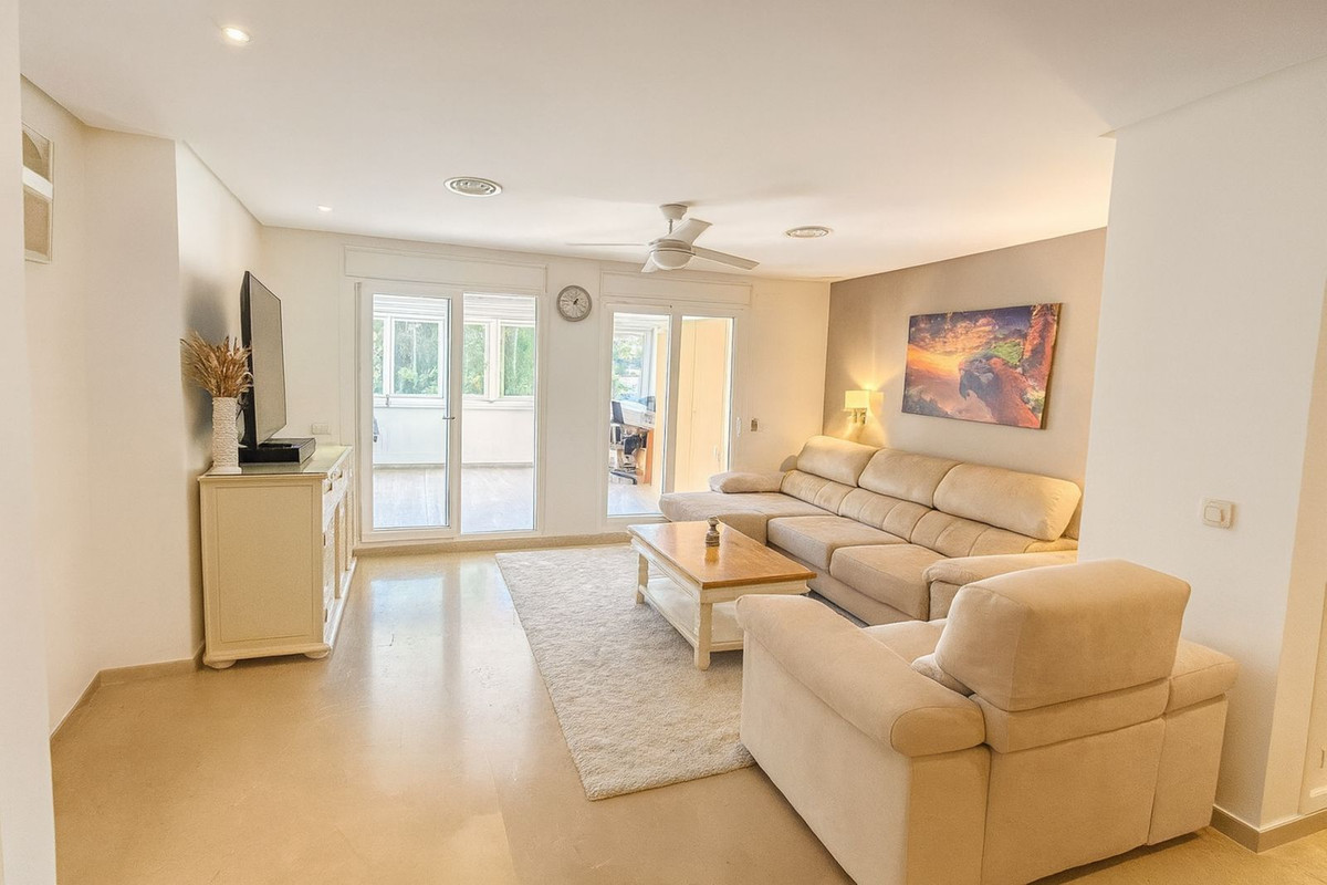 El amplio salón-comedor (40 m²) desemboca en la cocina independiente totalmente equipada. Desde el salón se ha creado una extensión inteligentemente diseñada, que puede utilizarse como tercer dormitorio adicional, gimnasio u oficina, con acceso directo a la generosa terraza de 46 m², que da a la primera de las cuatro piscinas comunitarias de la urbanización y a los jardines comunitarios, sin estar tan cerca como para que la piscina cause molestias.