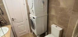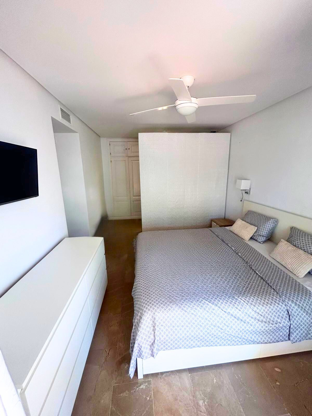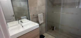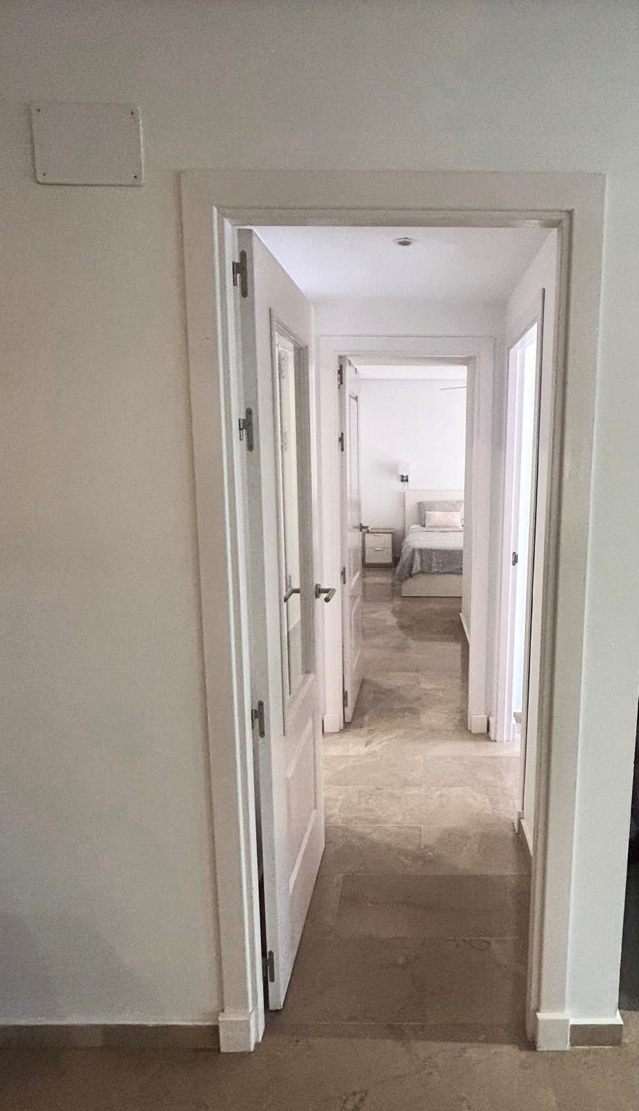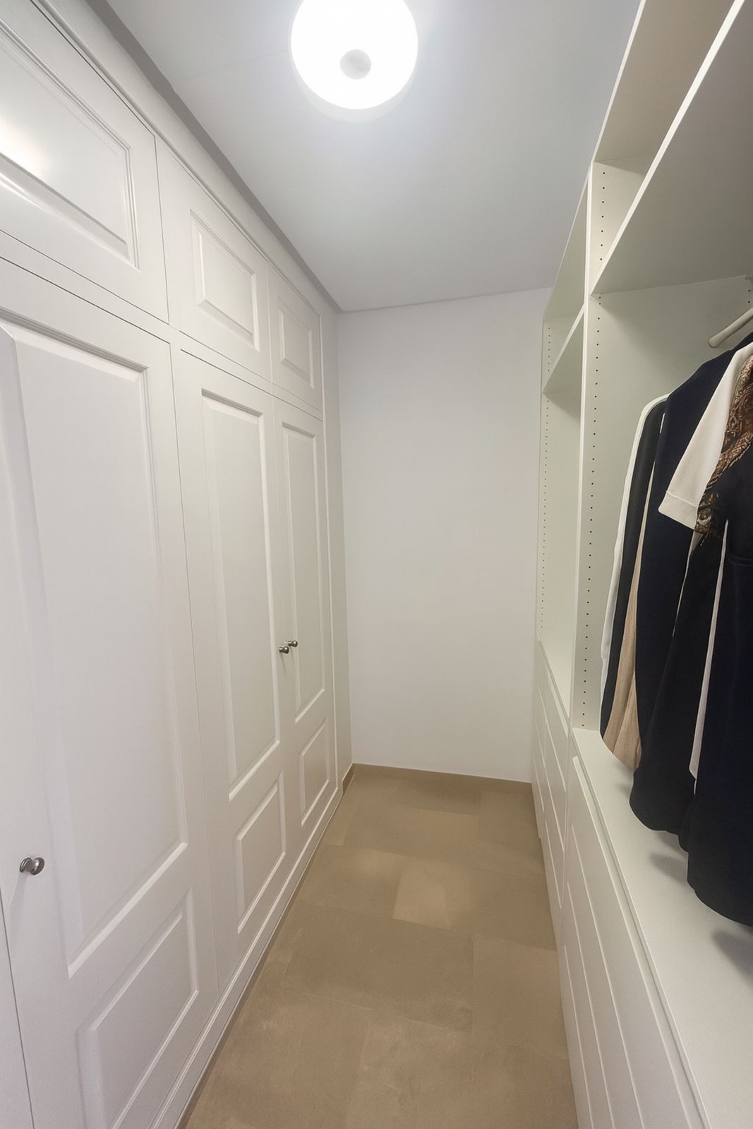 En el interior, un pasillo -que separa el salón de la zona de noche mediante una puerta de cristal para garantizar la máxima privacidad- conduce desde el salón/comedor a la zona de noche del apartamento. Esta zona alberga el dormitorio de invitados con un cuarto de baño independiente con ducha y WC. Al final del pasillo se encuentra la suite principal con vestidor y cuarto de baño privado, que incluye también una lavadora/secadora. Todos los dormitorios se abren directamente a la terraza a través de puertas de cristal, lo que permite que cada habitación disfrute de luz natural y vistas a la vegetación.