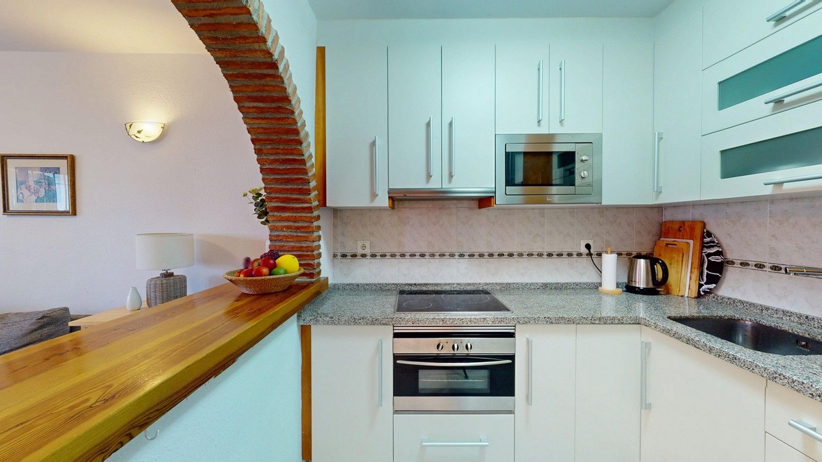 Dispone de 2 amplios dormitorios, un baño completo, y una cocina actualizada que conecta con el salón a través de un pasaplatos, ideal para integrarla y crear un espacio abierto y moderno. Todo orientado al oeste, lo que garantiza luz natural por las tardes y puestas de sol en la terraza.