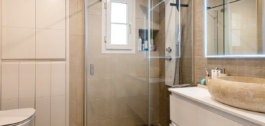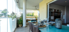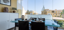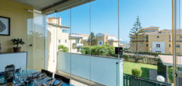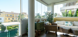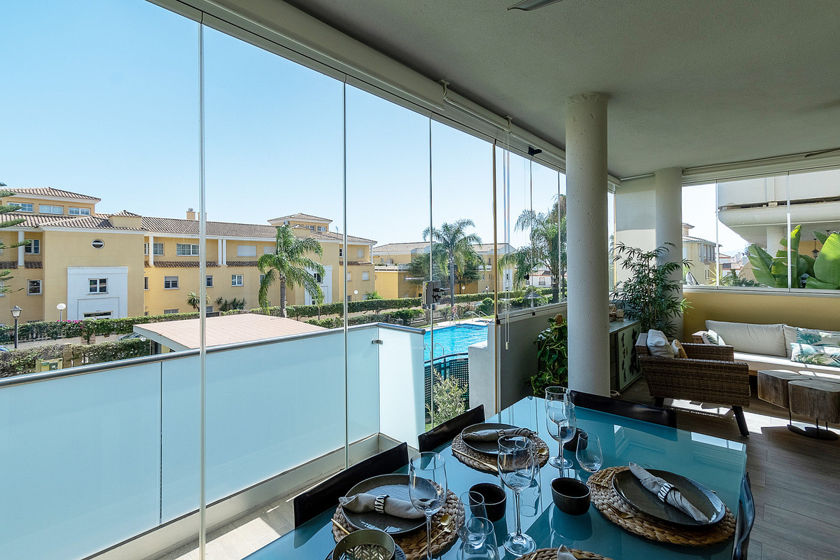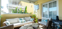 Está orientado al sur y hace esquina con el edificio. La terraza acristalada es una segunda estancia