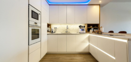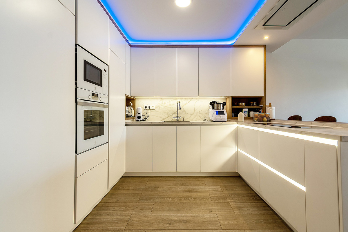 una cocina funcional, moderna y totalmente equipada, abierta al gran salón a la terraza y al