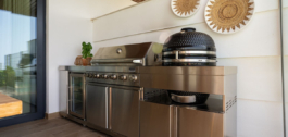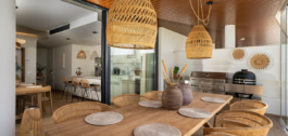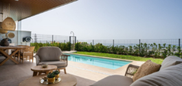 Espacio habitable: Amplia cocina abierta y comedor, junto con una sala de estar con grandes ventanales de cristal que se abren a una terraza cubierta y al jardín con piscina privada.