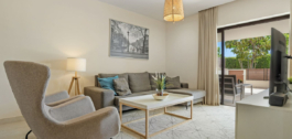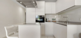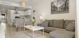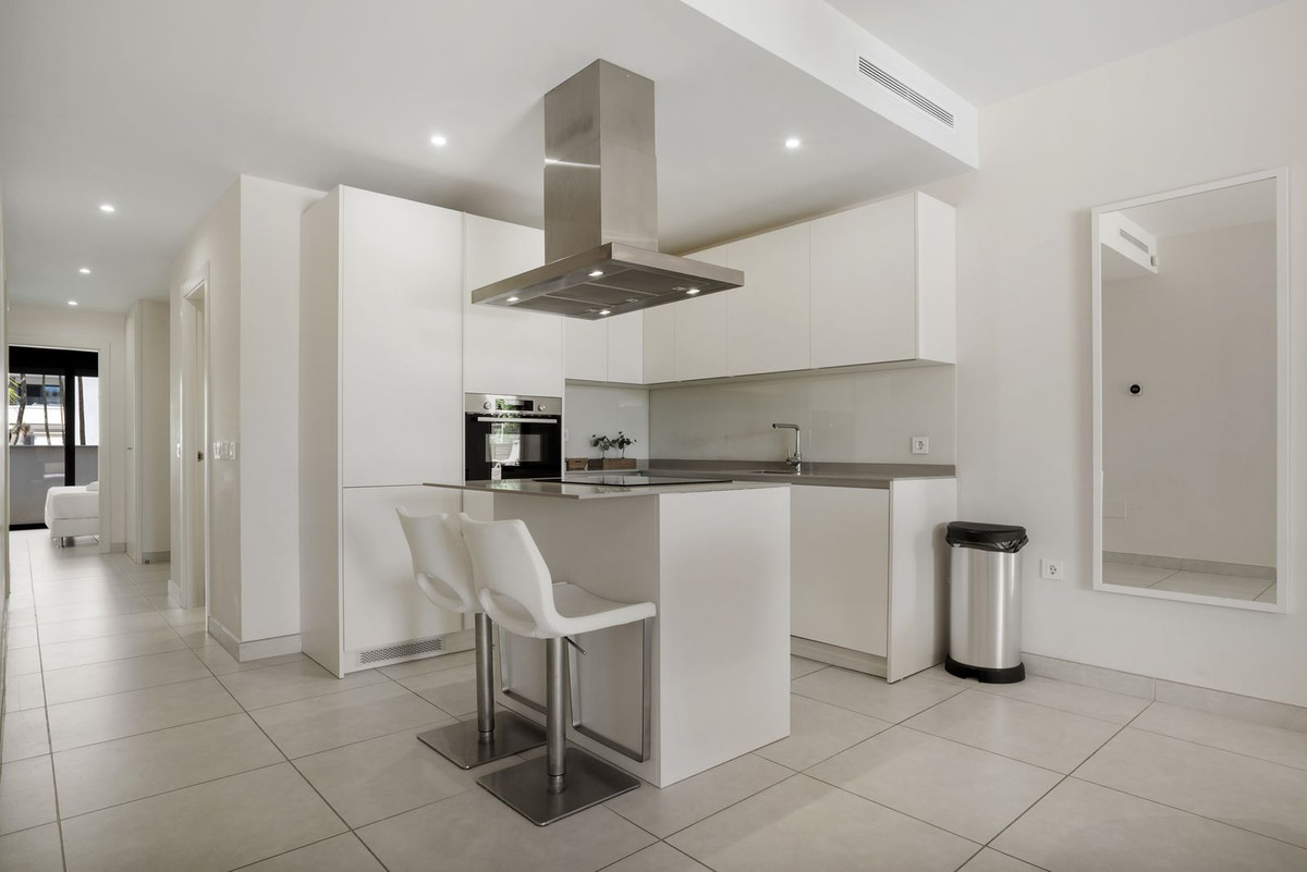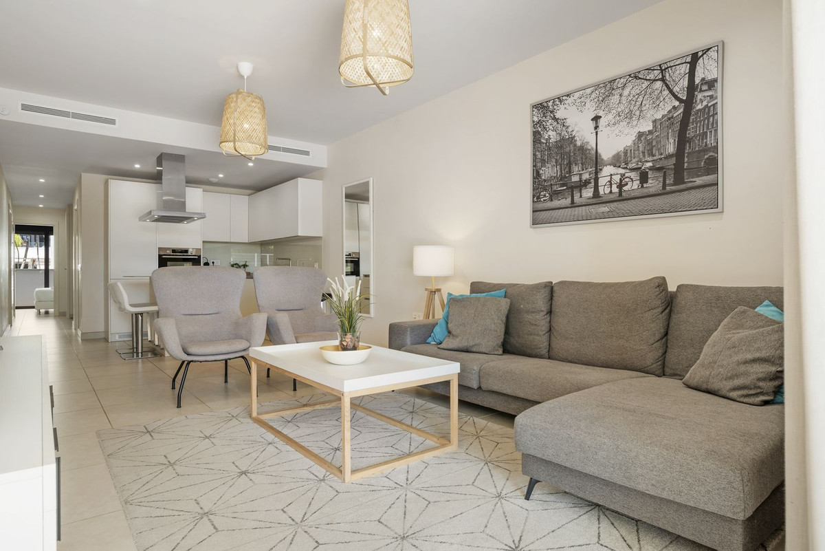 En la parte delantera del apartamento se encuentra el salón con una preciosa cocina abierta. Desde el salón se accede a la terraza, a la que se accede a través de unas bonitas puertas correderas que desaparecen en la pared.