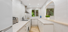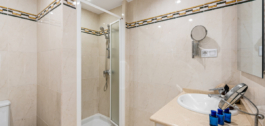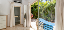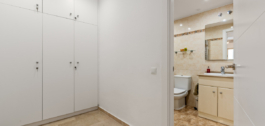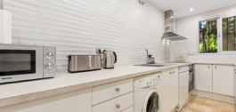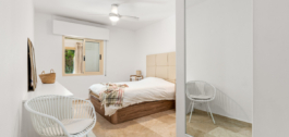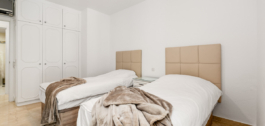 La propiedad está situada en la planta baja y tiene una gran terraza con vistas al Parque de la Constitución, así como acceso directo a las piscinas y jardines comunitarios. Hay un gran salón cuadrado con ventanas Franch a la terraza.