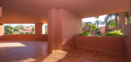 Fantástico apartamento de 201m2 construidos,183 m2 útiles en planta baja orientado al sur (elevado 2 metros sobre la planta baja), totalmente amueblado en una nueva urbanización junto a la playa situada en el corazón de la "Nueva Milla de Oro", cerca de los Hoteles de 5 estrellas Ikos y Las Dunas. La propiedad ofrece un hall de entrada, 4 dormitorios y 3 baños (2 de ellos en-suite con jacuzzi, una gran cocina totalmente equipada, un salón/comedor con acceso a una gran terraza cubierta de 104 m2 con preciosas vistas al jardín tropical. Todo el apartamento tiene acabados de alta calidad (mármol crema, granito y terracota en el suelo), teléfono, TV vía satélite, aire acondicionado frío-calor y alarma. La propiedad también cuenta con un lavadero útil al lado de la cocina, y una plaza de aparcamiento privado en el garaje subterráneo comunitario. Además, el complejo ofrece seguridad 18 horas al día y un conjunto de equipamientos de lujo como 2 magníficas piscinas (una exterior y otra interior y climatizada en el subterráneo), gimnasio, sauna y salón social.