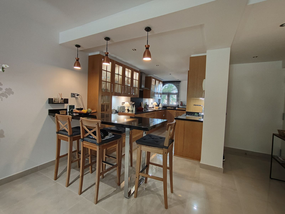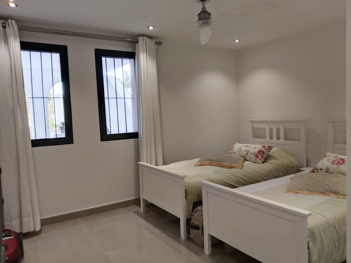 La propiedad cuenta con 2 amplios dormitorios y 2 baños – incluyendo una suite principal con su propio cuarto de baño privado, además de un elegante baño de invitados. Los luminosos y acogedores espacios de vida se abren directamente a un jardín privado con palmeras maduras y exuberante vegetación, creando un oasis de tranquilidad y total privacidad. El mobiliario es opcional, lo que permite a los compradores la flexibilidad de personalizar el espacio a su gusto.