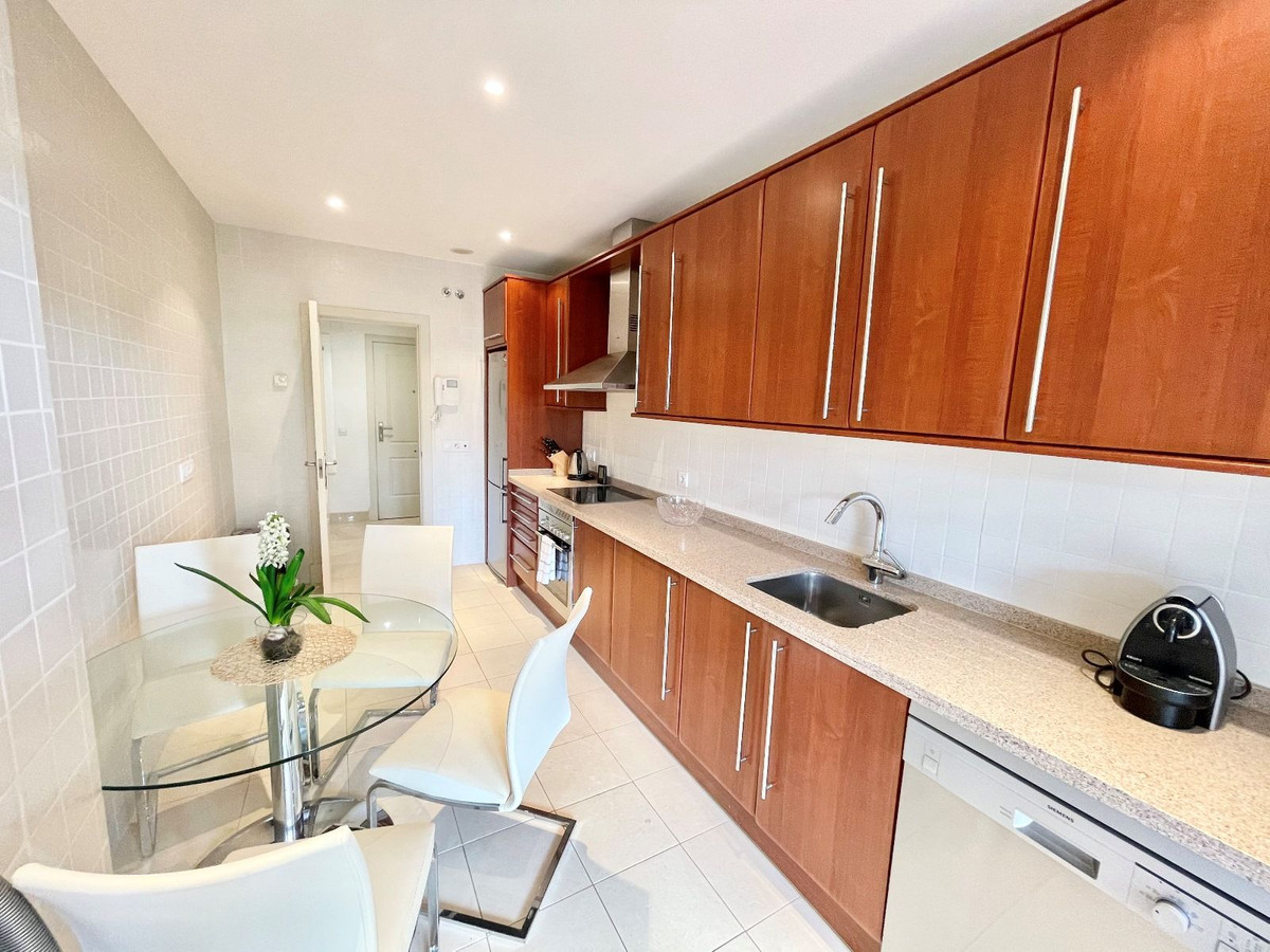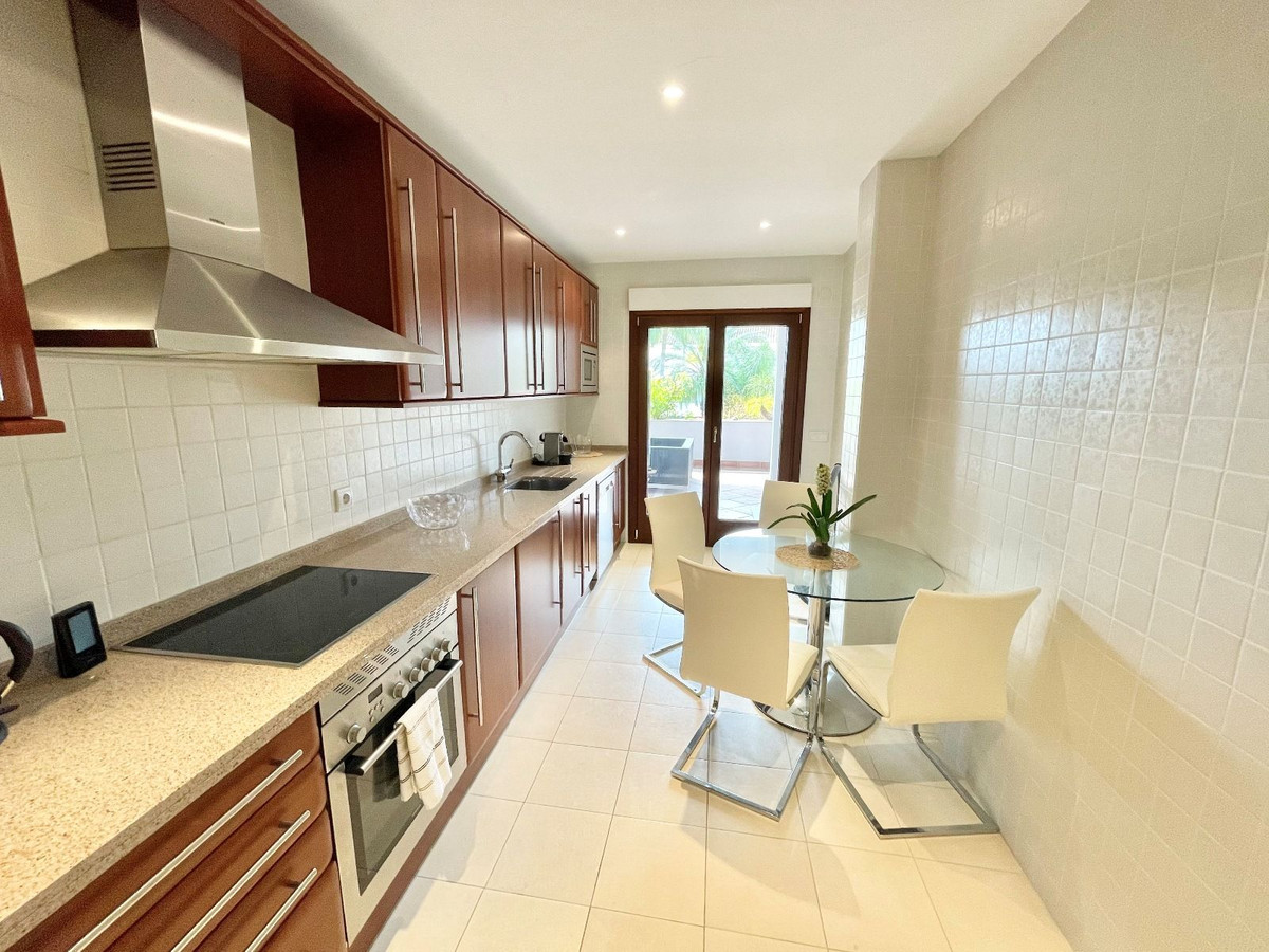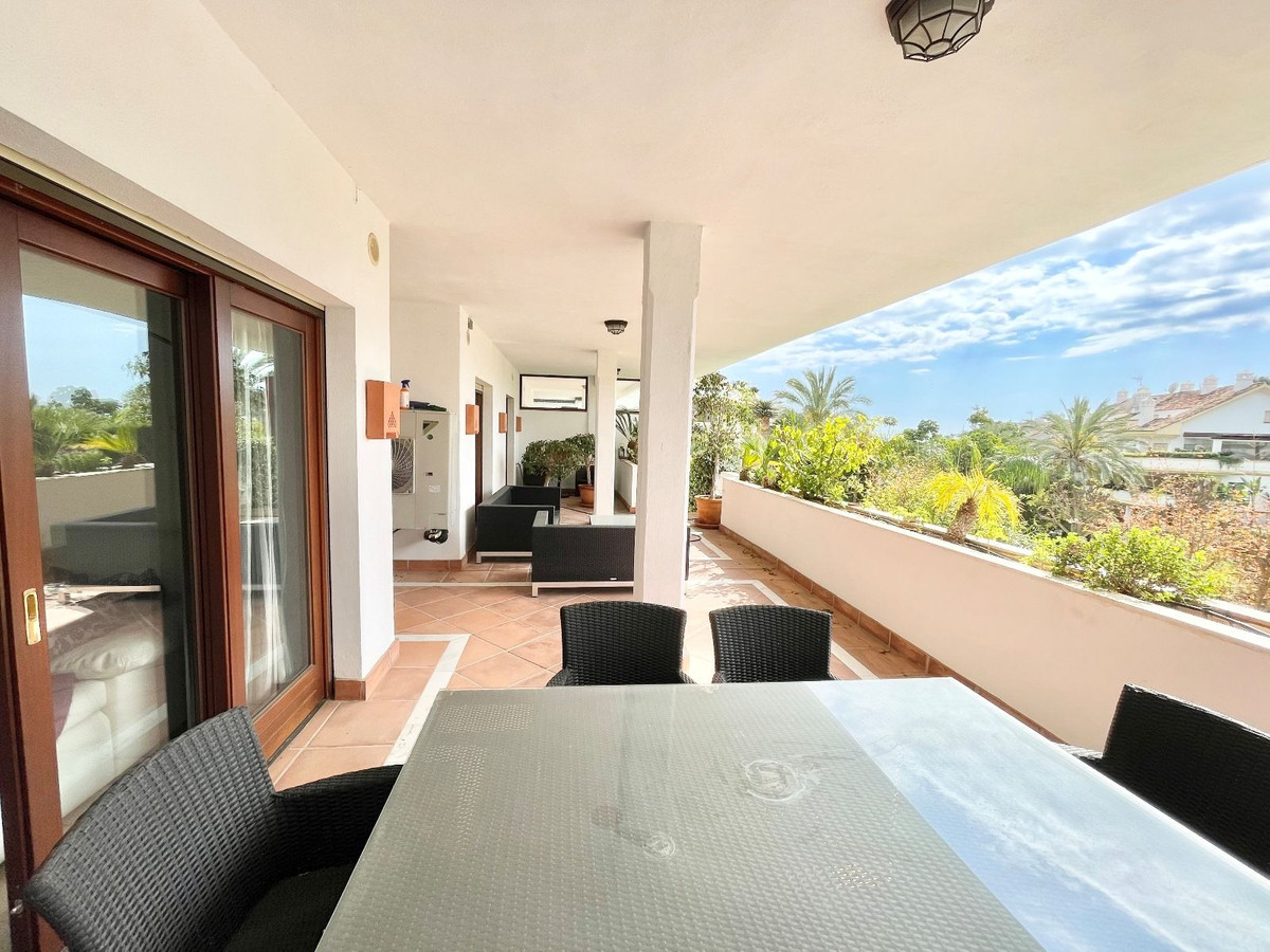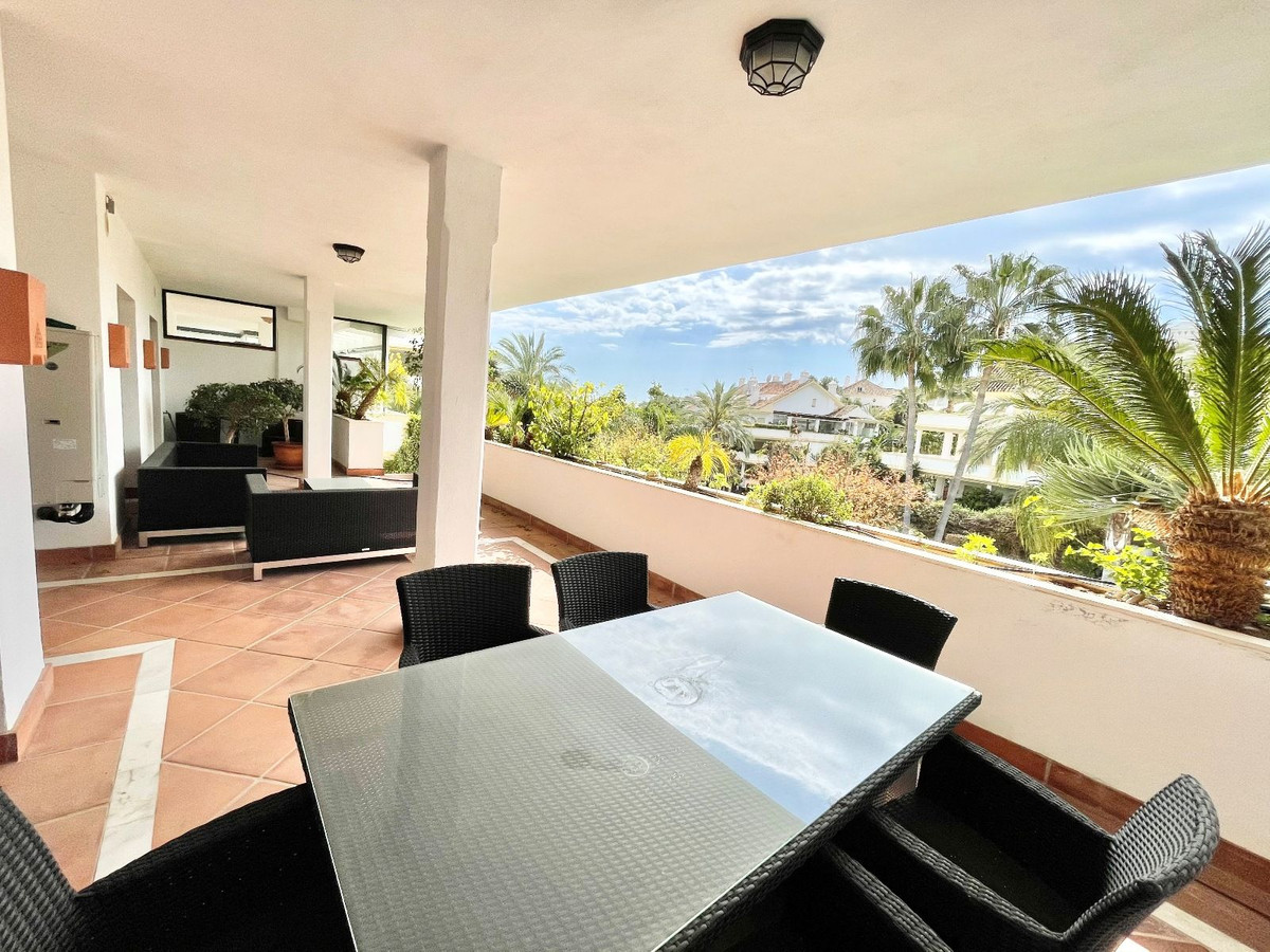 Amplio apartamento con gran terraza y vistas a la piscina y jardín, jardín privado con árboles, sol de tarde.