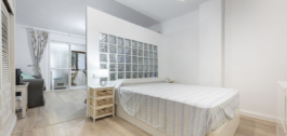 – Dormitorio separado del salón por una mampara de cristal que permite la entrada de luz natural.