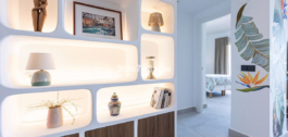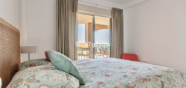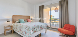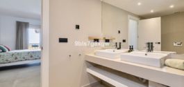 La suite principal, que da directamente a la terraza, incluye un vestidor y un moderno cuarto de baño de microcemento. El segundo dormitorio, ideal para invitados o niños, cuenta con armarios empotrados y un baño también acabado en microcemento.