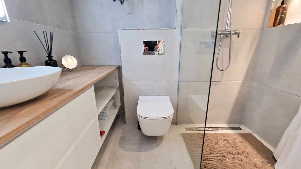 Cuarto de baño de lujo con ventilación eficiente, inodoro suspendido y elegantes acabados
