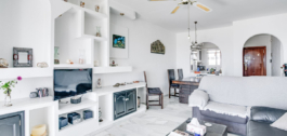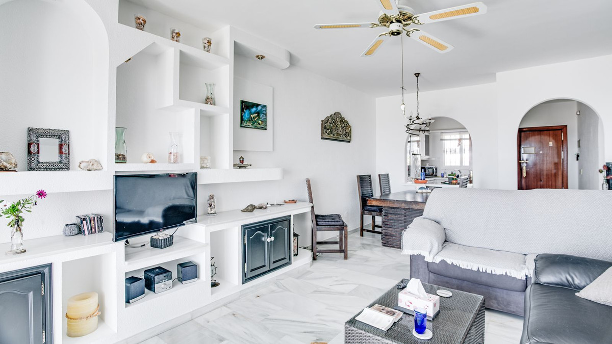Este apartamento está situado en la primera planta de un pequeño complejo residencial directamente en el campo de golf de El Chaparral. La ubicación es una de las zonas residenciales más solicitadas de la región. En pocos minutos, se puede llegar a la popular localidad costera de La Cala de Mijas, con restaurantes, tiendas y una playa bien cuidada. El salón es luminoso y ofrece acceso a la terraza con vistas al mar. Un pasillo conecta el salón con la cocina adyacente. El dormitorio principal también ofrece vistas al mar y un cuarto de baño en suite con bañera y ducha. El segundo cuarto de baño tiene una ducha y una zona de lavandería con lavadora y secadora – ambos baños tienen ventanas. El complejo consta de cuatro edificios, cada uno con cuatro apartamentos, y una piscina comunitaria. Una plaza de garaje cerrada está incluida en el precio. Las conexiones con Málaga y Marbella son excelentes.