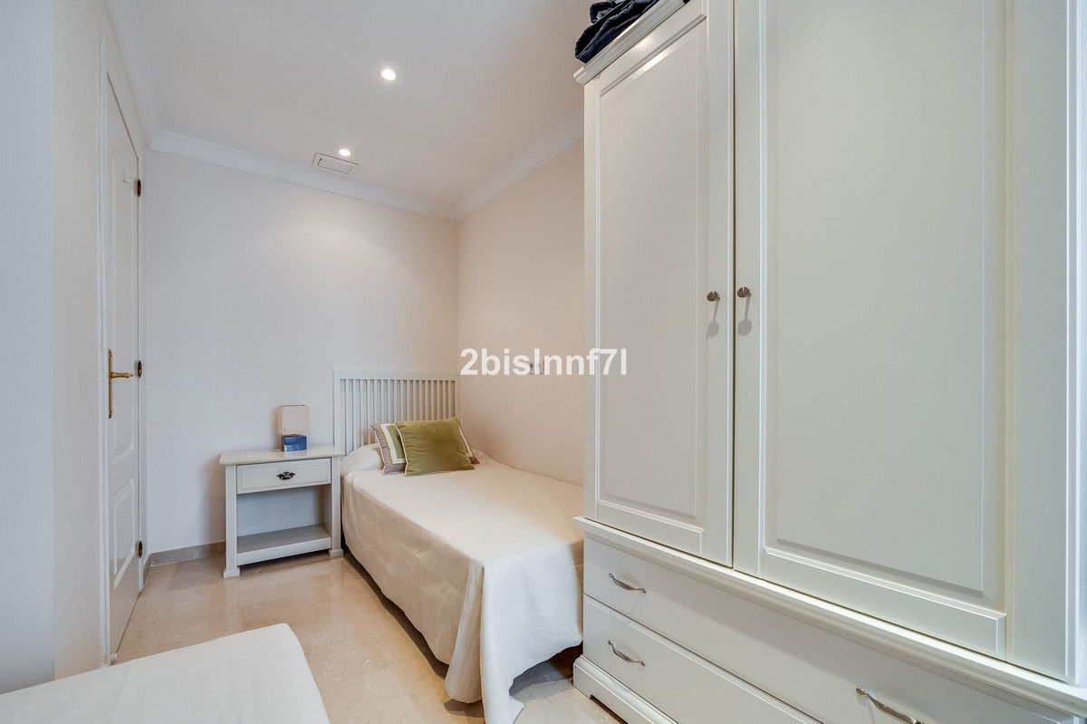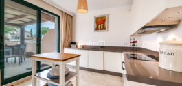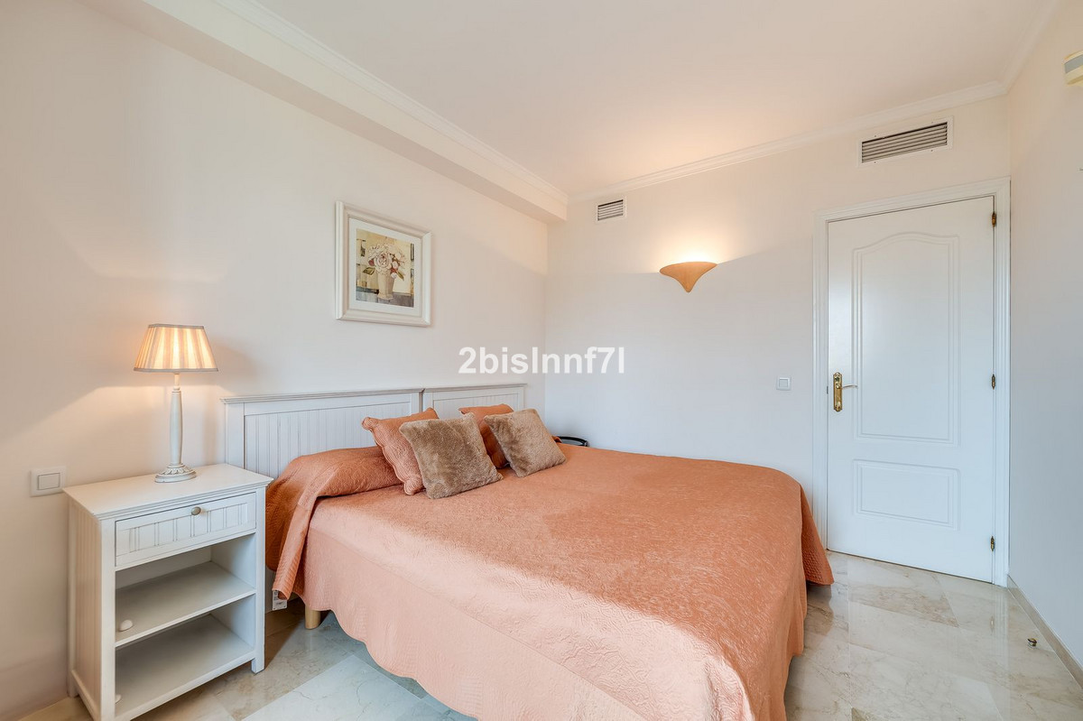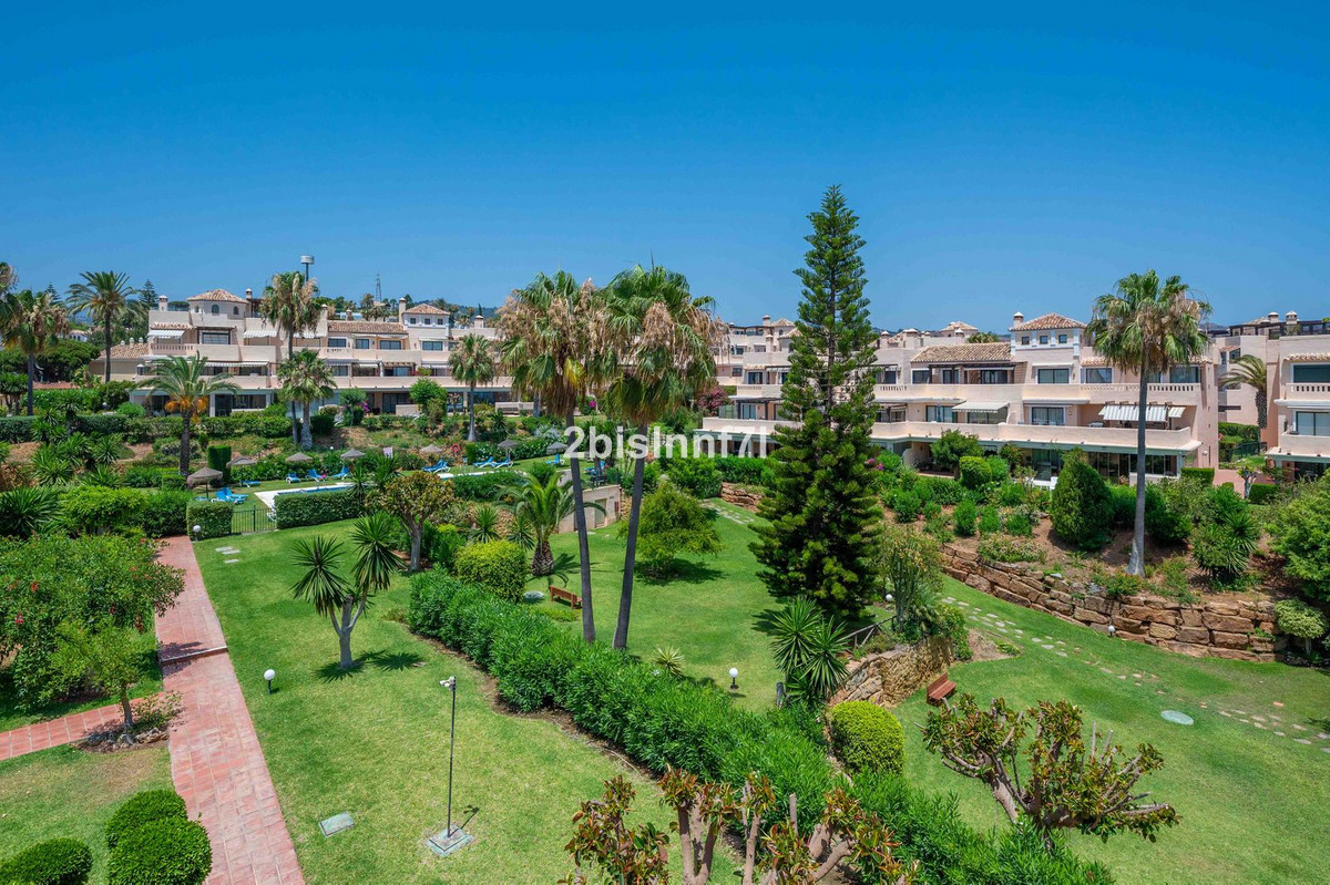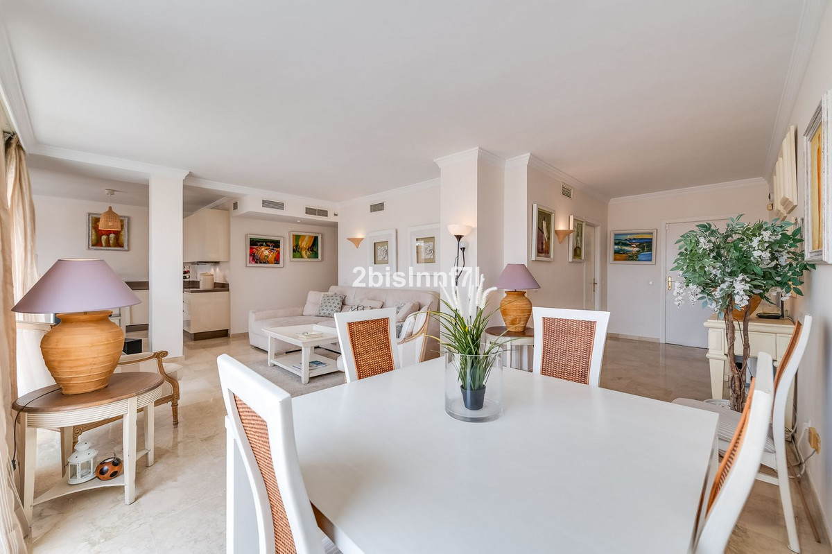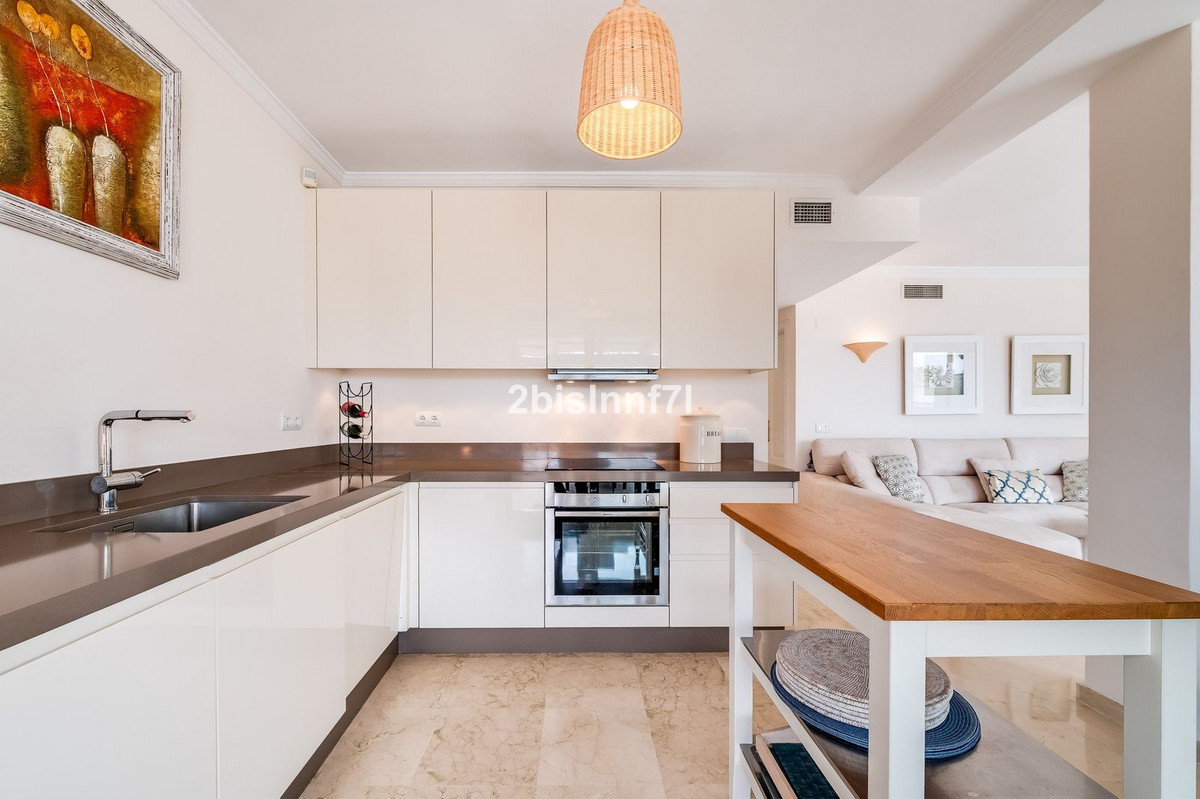 El apartamento consta de dos dormitorios de generosas dimensiones y un tercero más pequeño, ideal como habitación de invitados, despacho en casa o dormitorio infantil. Los dormitorios gozan de preciosas vistas a los jardines paisajistas. Los dos cuartos de baño han sido renovados y cuentan con calefacción por suelo radiante para el máximo confort. La cocina también ha sido completamente renovada con electrodomésticos de alta gama y un diseño moderno. Uno de los aspectos más destacados de esta propiedad es su espectacular y amplia terraza, con múltiples zonas para disfrutar de la vida al aire libre. Cuenta con un comedor cubierto ideal para comidas al aire libre, una encantadora zona chill-out y una zona para tomar el sol con tumbonas, todo ello con preciosas vistas. Gracias a su excelente orientación, el apartamento disfruta de la luz del sol durante todo el día, desde las 10 de la mañana hasta la puesta de sol. Desde la terraza también se puede disfrutar de una hermosa vista del mar en el horizonte.