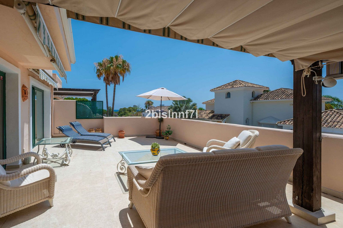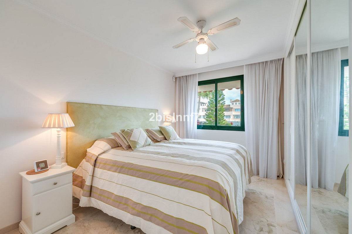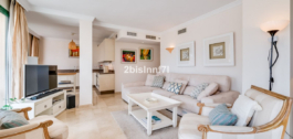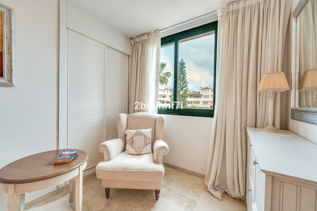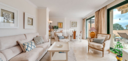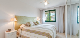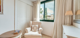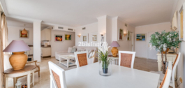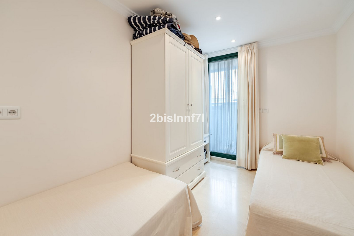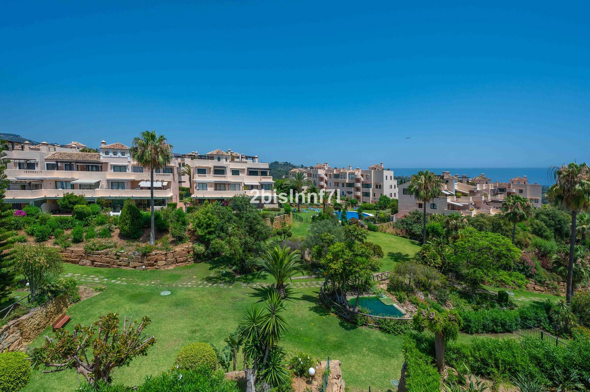 El apartamento consta de dos dormitorios de generosas dimensiones y un tercero más pequeño, ideal como habitación de invitados, despacho en casa o dormitorio infantil. Los dormitorios gozan de preciosas vistas a los jardines paisajistas. Los dos cuartos de baño han sido renovados y cuentan con calefacción por suelo radiante para el máximo confort. La cocina también ha sido completamente renovada con electrodomésticos de alta gama y un diseño moderno. Uno de los aspectos más destacados de esta propiedad es su espectacular y amplia terraza, con múltiples zonas para disfrutar de la vida al aire libre. Cuenta con un comedor cubierto ideal para comidas al aire libre, una encantadora zona chill-out y una zona para tomar el sol con tumbonas, todo ello con preciosas vistas. Gracias a su excelente orientación, el apartamento disfruta de la luz del sol durante todo el día, desde las 10 de la mañana hasta la puesta de sol. Desde la terraza también se puede disfrutar de una hermosa vista del mar en el horizonte.