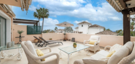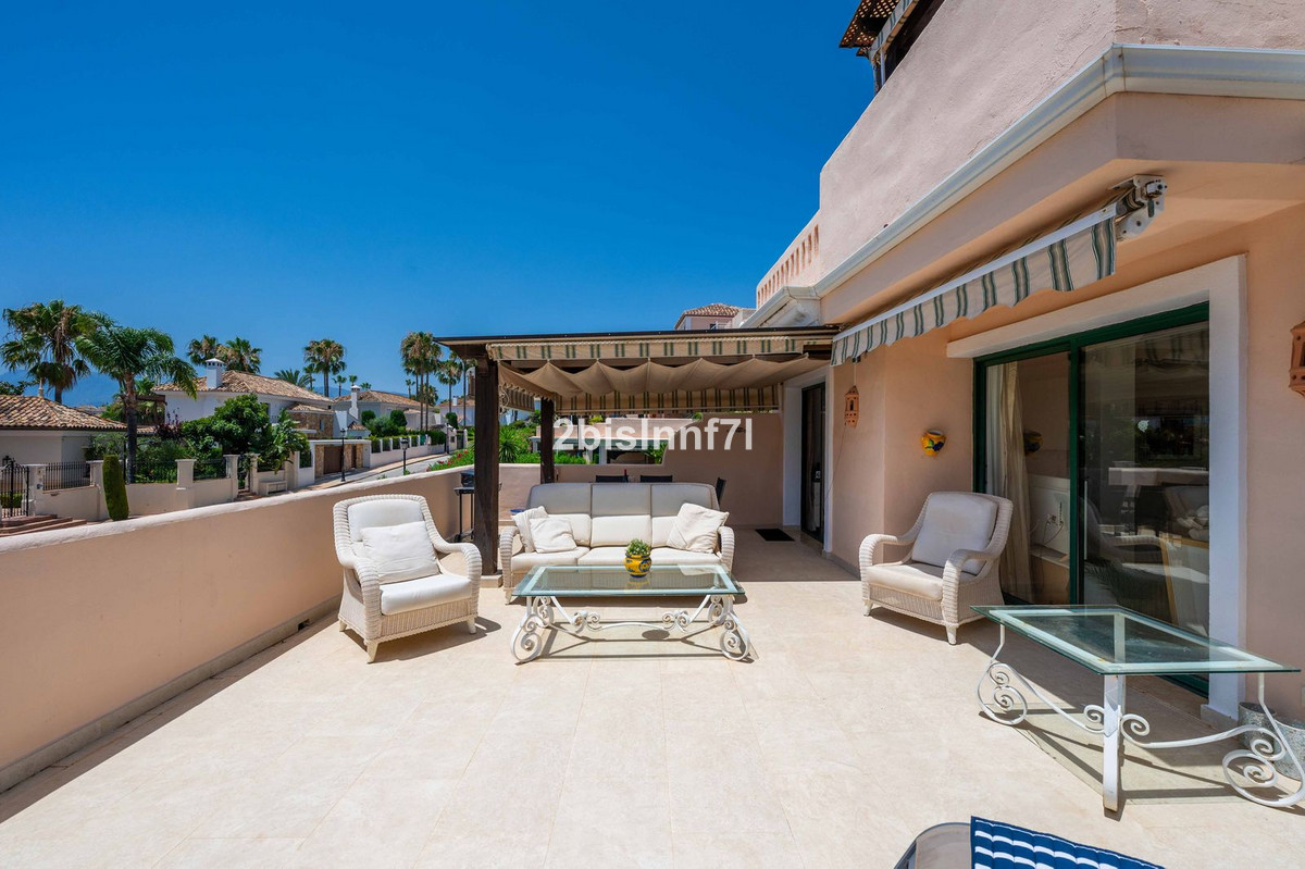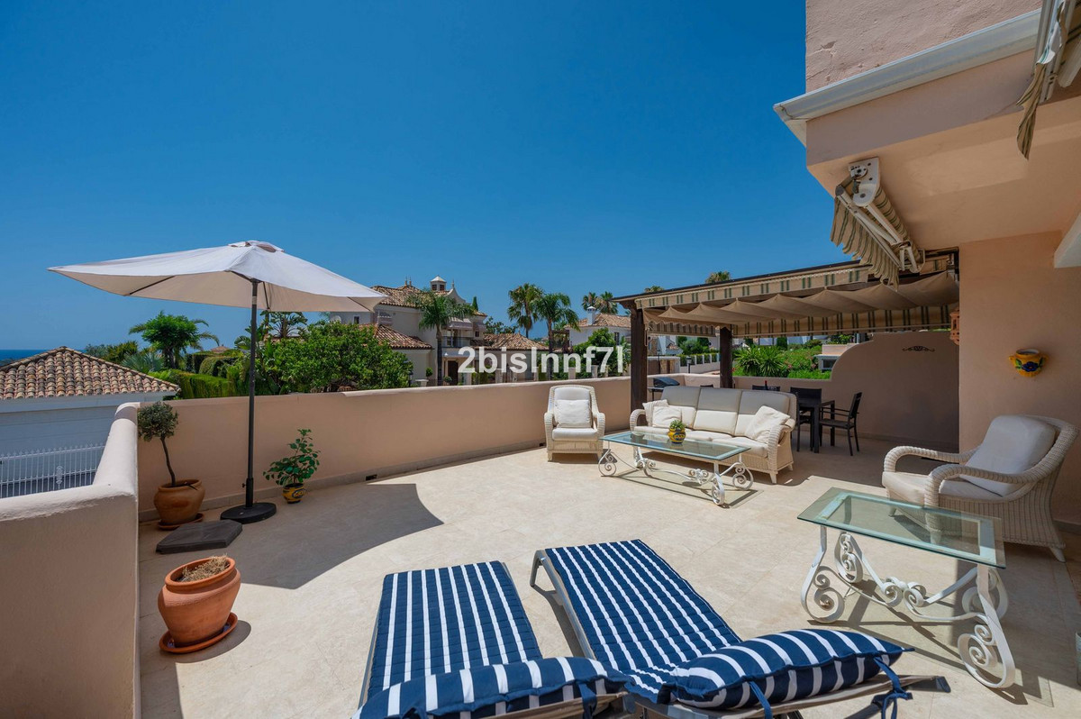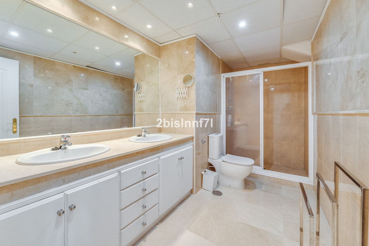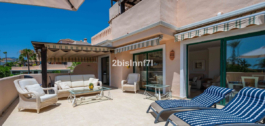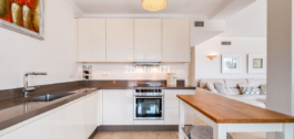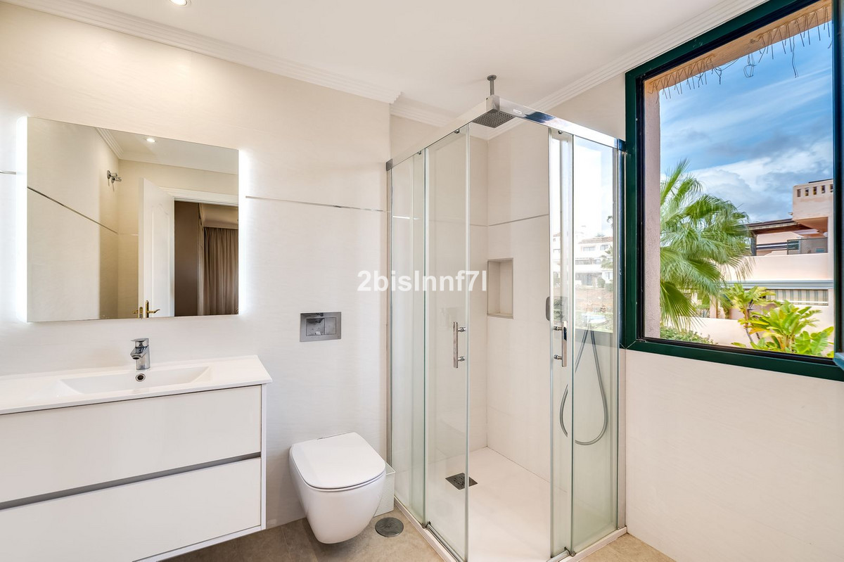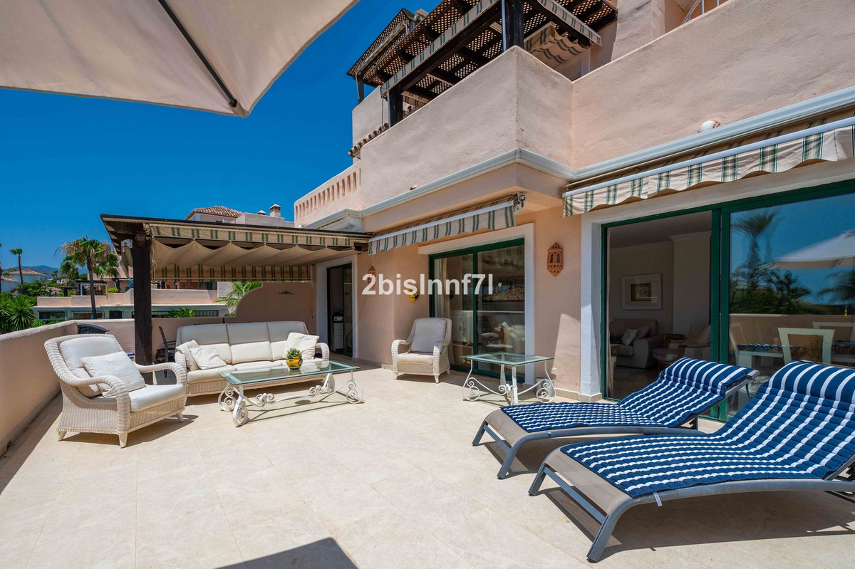 El apartamento consta de dos dormitorios de generosas dimensiones y un tercero más pequeño, ideal como habitación de invitados, despacho en casa o dormitorio infantil. Los dormitorios gozan de preciosas vistas a los jardines paisajistas. Los dos cuartos de baño han sido renovados y cuentan con calefacción por suelo radiante para el máximo confort. La cocina también ha sido completamente renovada con electrodomésticos de alta gama y un diseño moderno. Uno de los aspectos más destacados de esta propiedad es su espectacular y amplia terraza, con múltiples zonas para disfrutar de la vida al aire libre. Cuenta con un comedor cubierto ideal para comidas al aire libre, una encantadora zona chill-out y una zona para tomar el sol con tumbonas, todo ello con preciosas vistas. Gracias a su excelente orientación, el apartamento disfruta de la luz del sol durante todo el día, desde las 10 de la mañana hasta la puesta de sol. Desde la terraza también se puede disfrutar de una hermosa vista del mar en el horizonte.