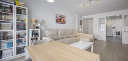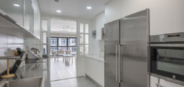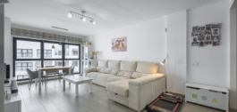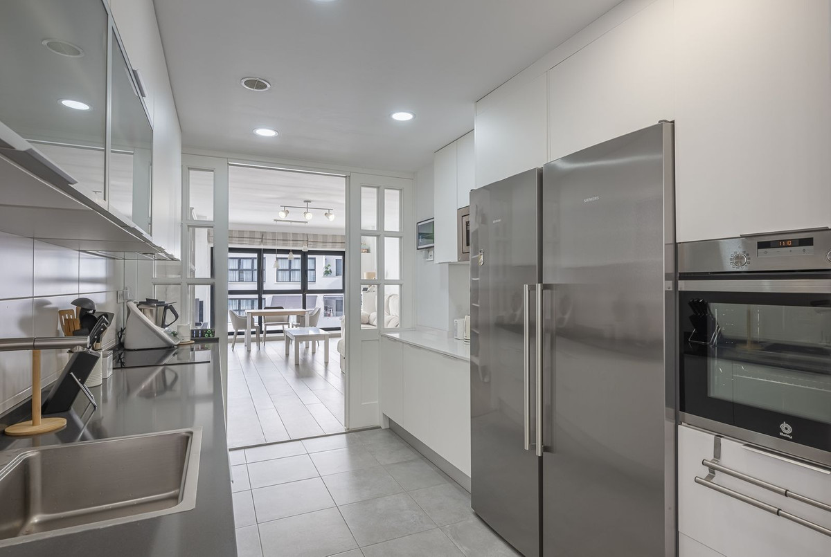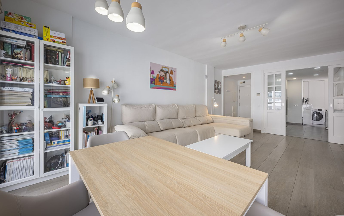 La cocina es independiente pero dispone de puertas correderas a medida que se abren hacia el exterior, lo que permite conectarla con el salón-comedor cuando se desee, sin ocupar espacio y creando una sensación de amplitud y fluidez. El apartamento ofrece tres dormitorios con armarios empotrados, el principal con baño en suite, más un segundo baño completo.