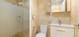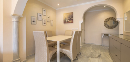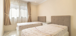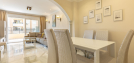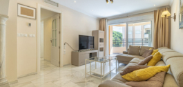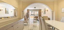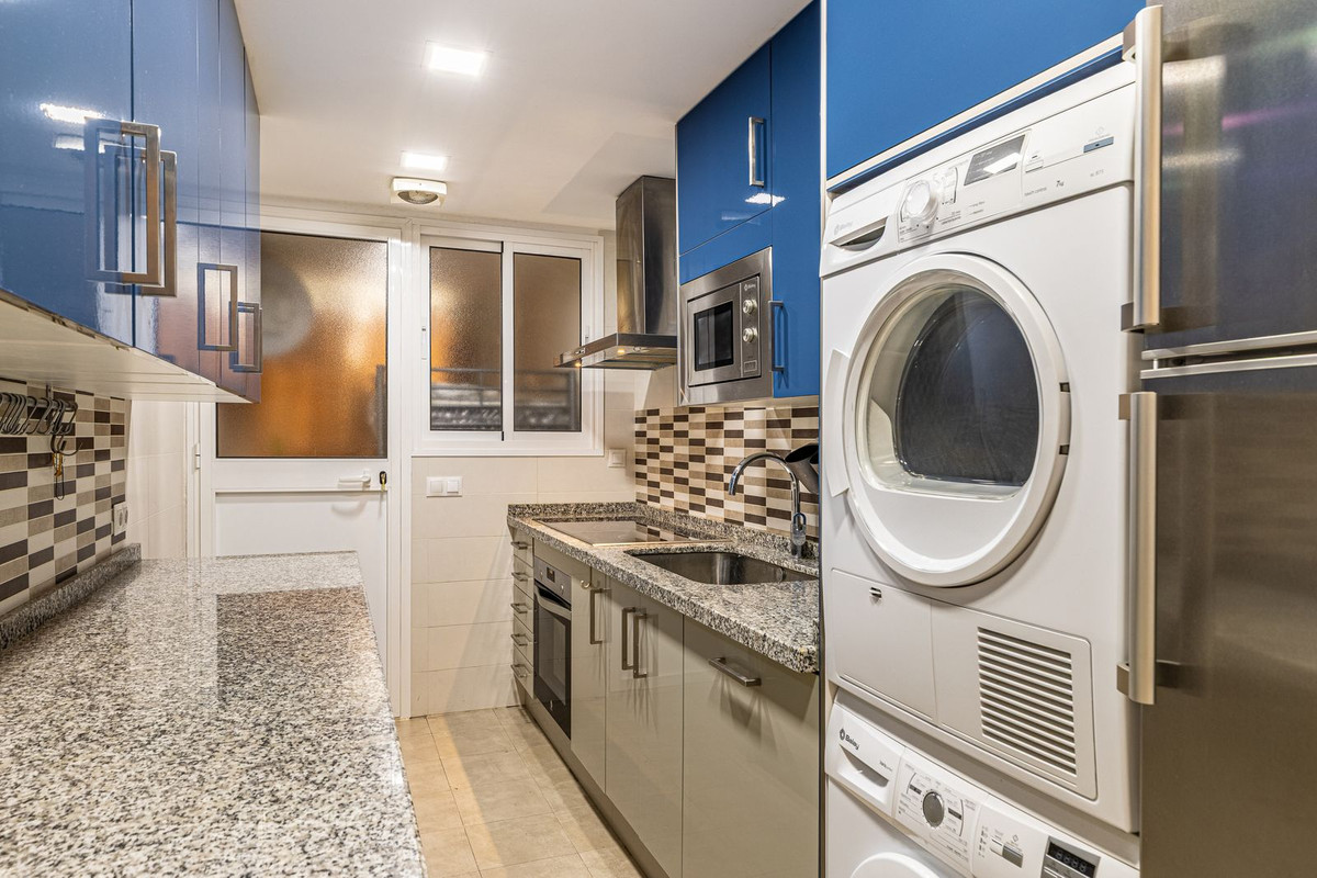 Impecable apartamento de esquina en la quinta planta con vistas a la piscina y sol de la mañana. La vivienda ha sido completamente reformada y está lista para entrar a vivir. Dispone de salón-comedor con acceso a la terraza, cocina totalmente equipada con lavadero, dormitorio principal con baño en suite y armarios empotrados, y dos dormitorios más, cada uno con baño propio. Al hacer esquina, la vivienda goza de mucha luz natural. El aparcamiento es comunitario y cerrado con puerta. El edificio dispone de jardín y piscina comunitarios. Situado en pleno centro de la ciudad, a un paso del paseo marítimo de Marbella y de la playa.
