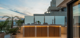 La amplia terraza de 155 m² está cuidadosamente diseñada con múltiples zonas, incluida una cocina exterior con iluminación, quemadores de gas dobles y preparación para una nevera, así como una zona chill-out y una piscina de inmersión, perfecta para el entretenimiento o la relajación con el espectacular telón de fondo costero.
