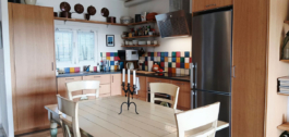 La sala de estar principal de unos 30 m² cuenta con un luminoso salón-comedor de planta abierta con una cocina de madera maciza, creando un ambiente cálido y acogedor. El espacio se ve realzado por una elegante chimenea, iluminación LED para un ambiente suave y una distribución en dos niveles que añade encanto y carácter a la vivienda.