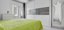 El dormitorio principal es generoso en tamaño y cuenta con un cuarto de baño con doble lavabo y ducha, así como tres armarios empotrados y acceso a la terraza principal. El segundo dormitorio, con armarios empotrados lacados en blanco y balcón privado, está situado junto a un moderno cuarto de baño reformado con ducha.