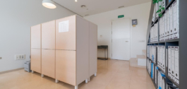Luminoso y espacioso, el interior de 92 m² se distribuye en dos plantas con grandes ventanales y versátiles opciones de distribución. La planta baja incluye una recepción, un espacio de trabajo y un almacén; la planta superior es diáfana, adecuada para oficinas, reuniones o uso médico.